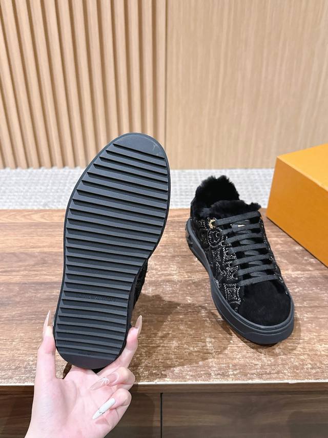/ 驴家新款羊羔毛 Logo刺绣滑板鞋 经典厚底运动鞋本款Time Out 运动鞋为柔软牛皮革压印迷你 Monogram图案,焕新Lv 的经典设计。3D标识点缀,加
