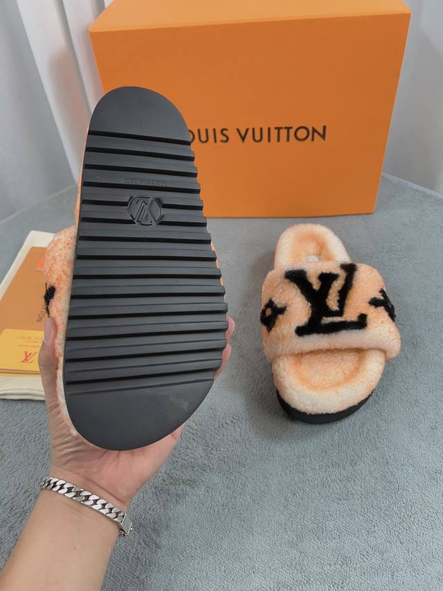 驴家Lv路易威登 爆款上市 Louis Vuitton 新款羊毛拖鞋细柔软羊毛 頂级品质纯皮毛一体直毛打造!超温暖的感觉,穿上仿佛踩在云朵上Lv经典老花装饰,精致高级!让这双毛拖身价陡增!鞋底是原版开模的Eva发泡防滑大底,非常好穿不打滑,而且鞋底有一定厚度,舒适度极佳! 鞋面:原版澳洲羊毛 内里:澳洲羊毛 垫脚:澳洲羊毛 大底:原版发泡底 底高:3.5Cm 包装:原版抽屉盒 码数:35-46 34 46定制不退换 颜色:官网同步色批: