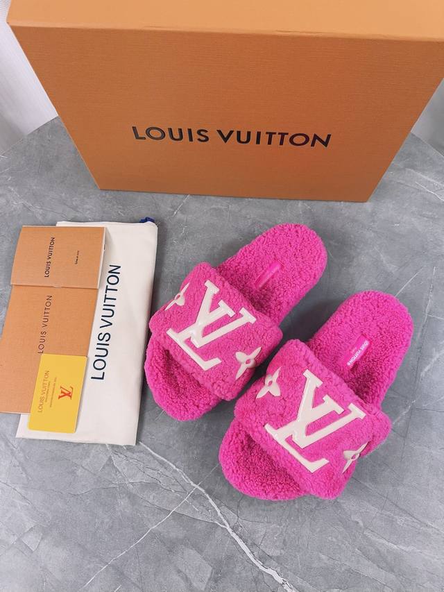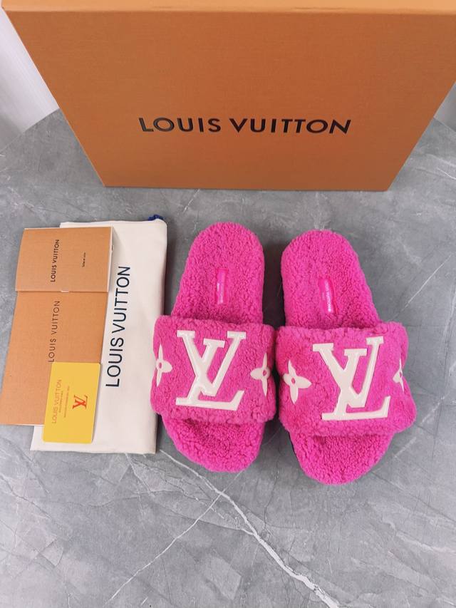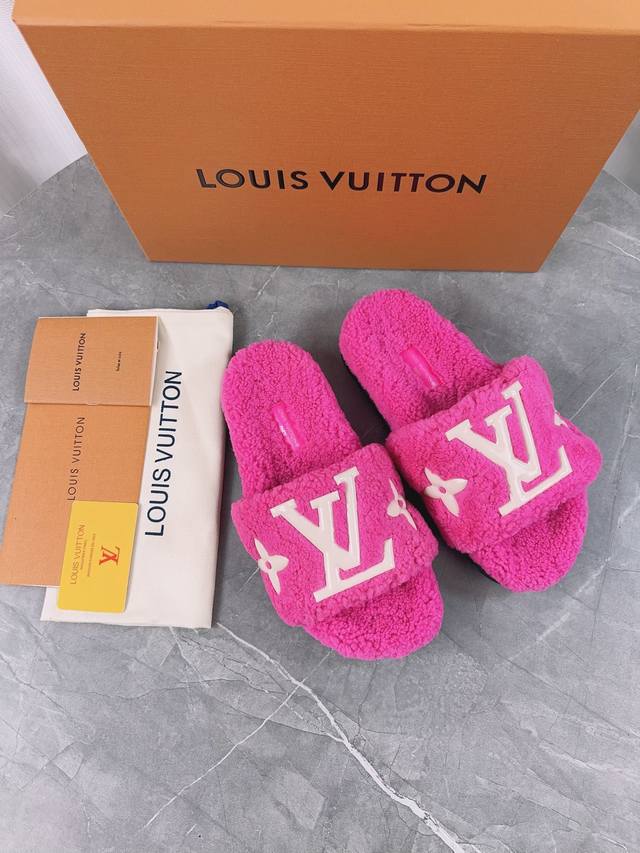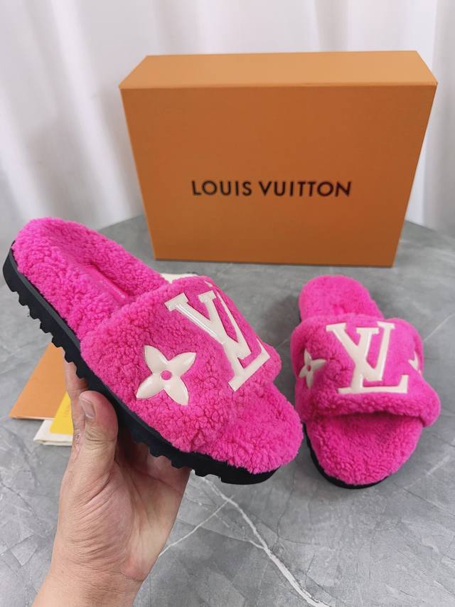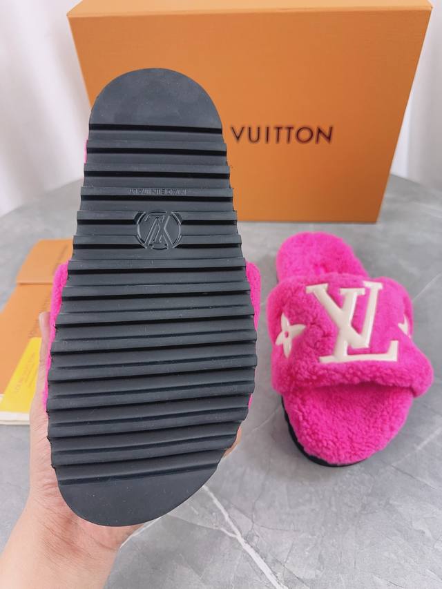 驴家Lv路易威登 爆款上市 Louis Vuitton 新款羊毛拖鞋细柔软羊毛 頂级品质纯皮毛一体直毛打造!超温暖的感觉,穿上仿佛踩在云朵上Lv经典老花装饰,精致高级!让这双毛拖身价陡增!鞋底是原版开模的Eva发泡防滑大底,非常好穿不打滑,而且鞋底有一定厚度,舒适度极佳! 鞋面:原版澳洲羊毛 内里:澳洲羊毛 垫脚:澳洲羊毛 大底:原版发泡底 底高:3.5Cm 包装:原版抽屉盒 码数:35-40 34 40 41定制不退换 颜色:官网同步色批: