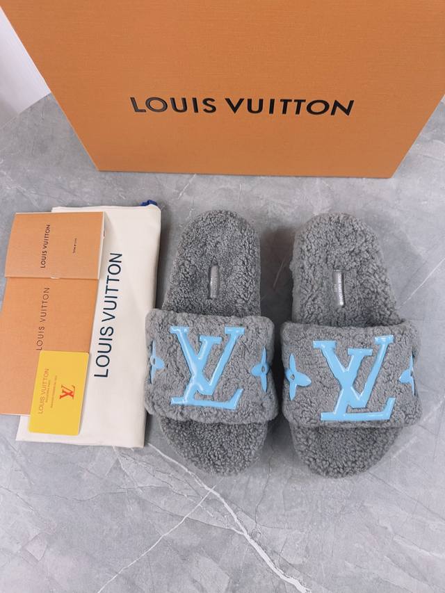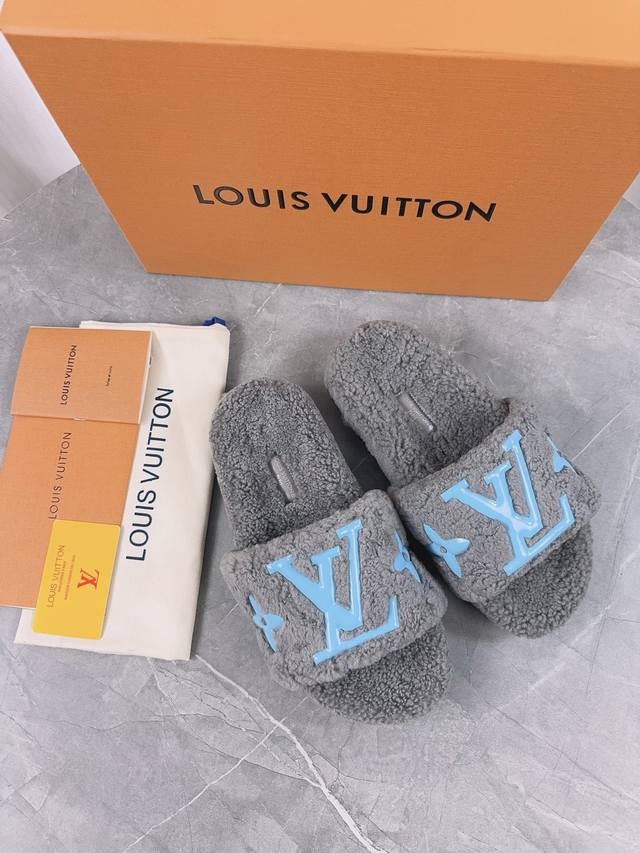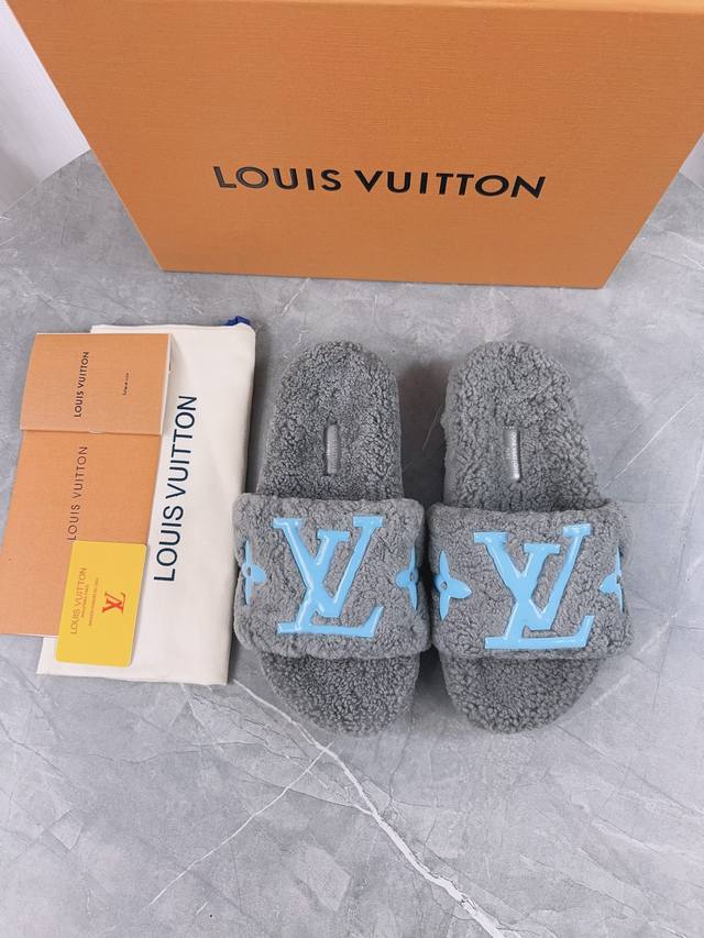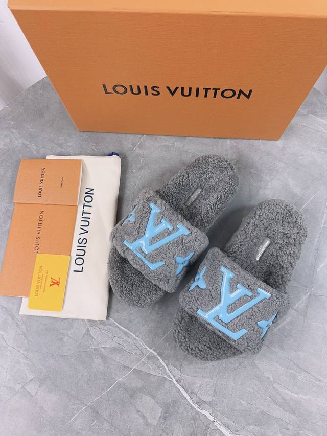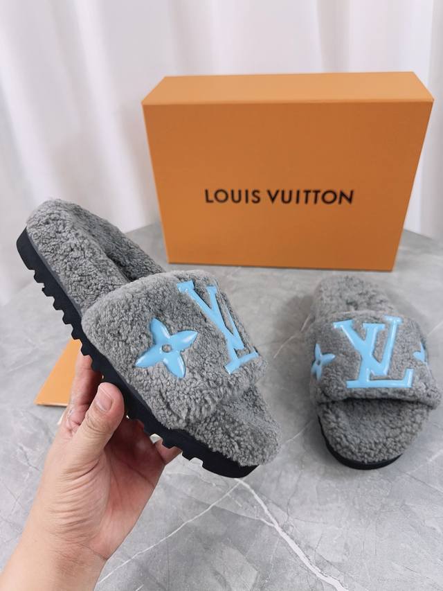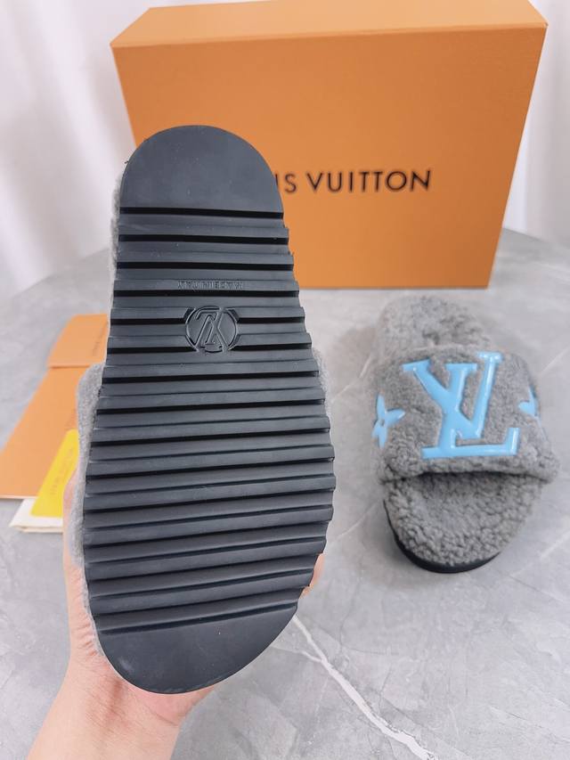 驴家Lv路易威登 爆款上市 Louis Vuitton 新款羊毛拖鞋细柔软羊毛 頂级品质纯皮毛一体直毛打造!超温暖的感觉,穿上仿佛踩在云朵上Lv经典老花装饰,精致高级!让这双毛拖身价陡增!鞋底是原版开模的Eva发泡防滑大底,非常好穿不打滑,而且鞋底有一定厚度,舒适度极佳! 鞋面:原版澳洲羊毛 内里:澳洲羊毛 垫脚:澳洲羊毛 大底:原版发泡底 底高:3.5Cm 包装:原版抽屉盒 码数:35-40 34 40 41定制不退换 颜色:官网同步色批: