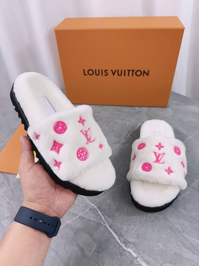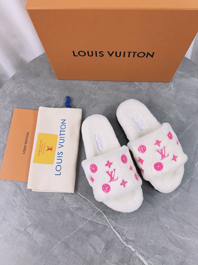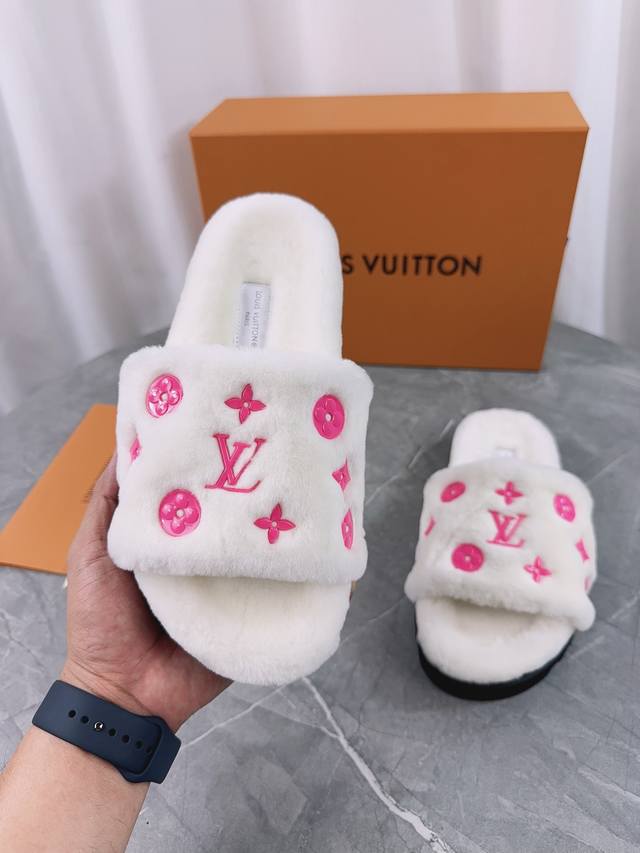 驴家Lv路易威登 爆款上市 Louis Vuitton 新款羊毛拖鞋细柔软羊毛 頂级品质纯皮毛一体直毛打造!超温暖的感觉,穿上仿佛踩在云朵上Lv经典老花装饰,精致高级!让这双毛拖身价陡增!鞋底是原版开模的Eva发泡防滑大底,非常好穿不打滑,而且鞋底有一定厚度,舒适度极佳! 鞋面:原版澳洲羊毛 内里:澳洲羊毛 垫脚:澳洲羊毛 大底:原版发泡底 底高:3.5Cm 包装:原版抽屉盒 码数:35-40 34 40 41定制不退换 颜色:官网同步色批: