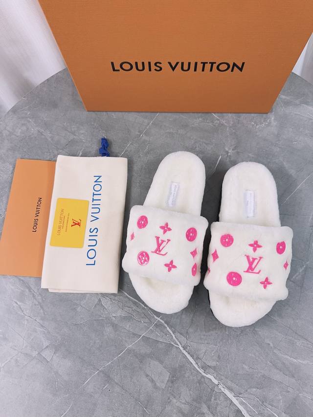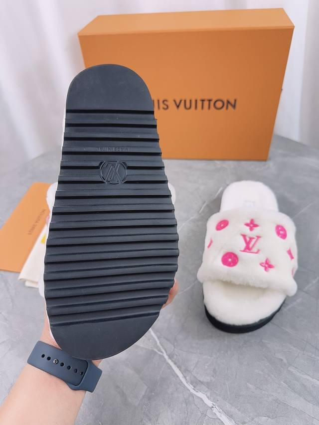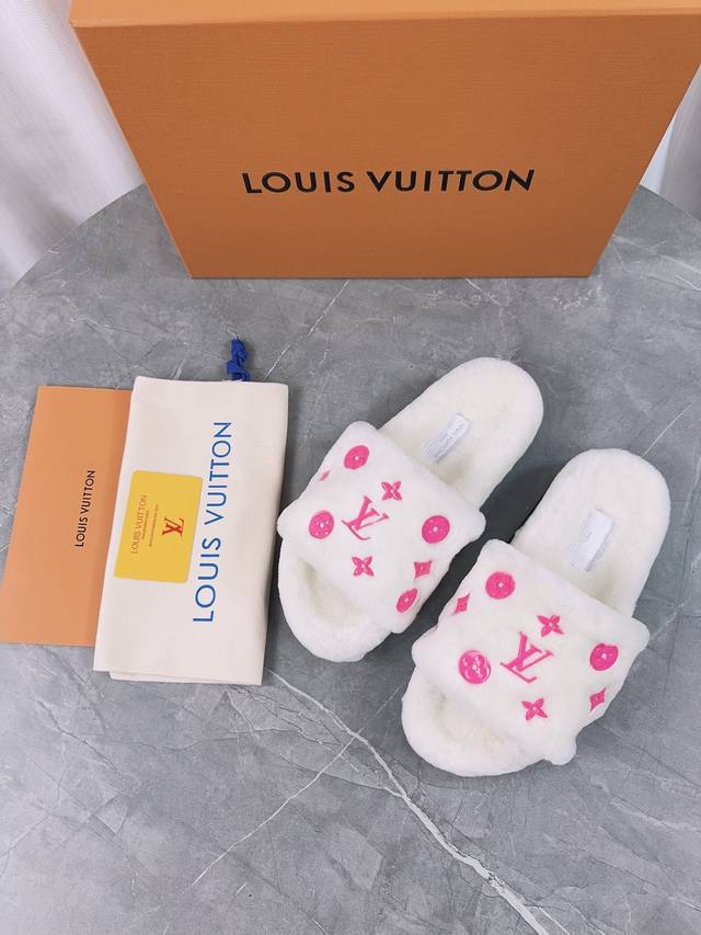 驴家Lv路易威登 爆款上市 Louis Vuitton 新款羊毛拖鞋细柔软羊毛 頂级品质纯皮毛一体直毛打造!超温暖的感觉,穿上仿佛踩在云朵上Lv经典老花装饰,精