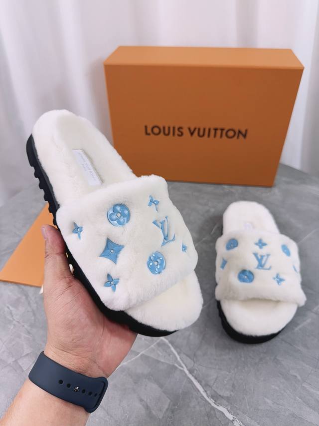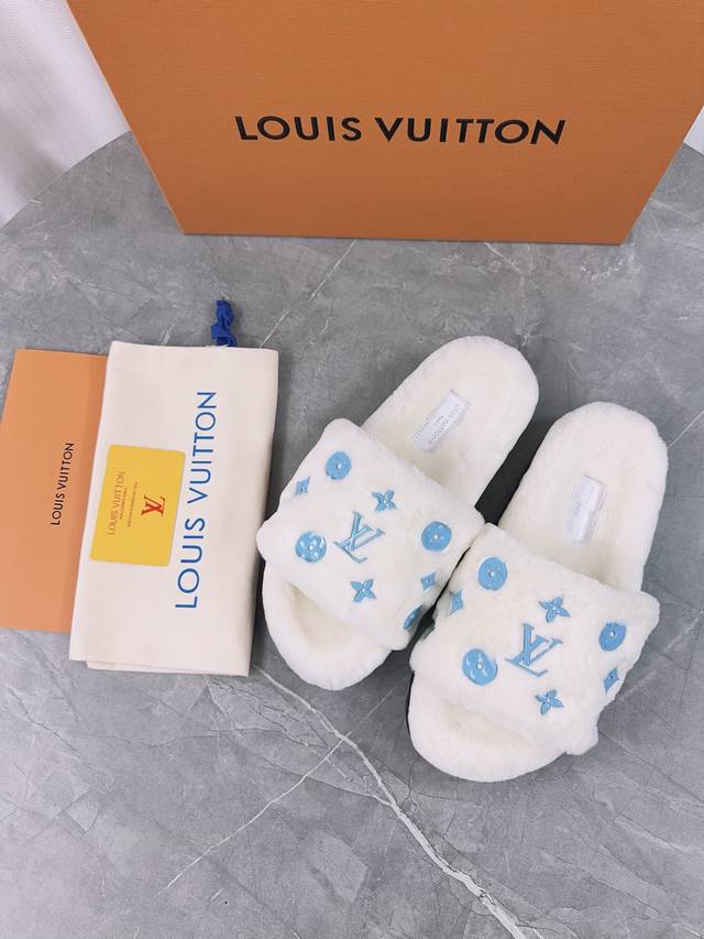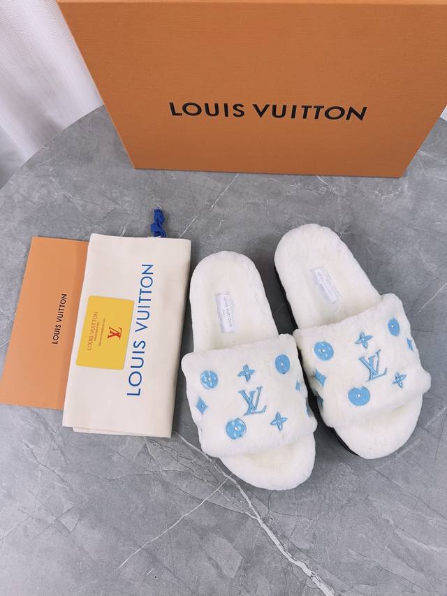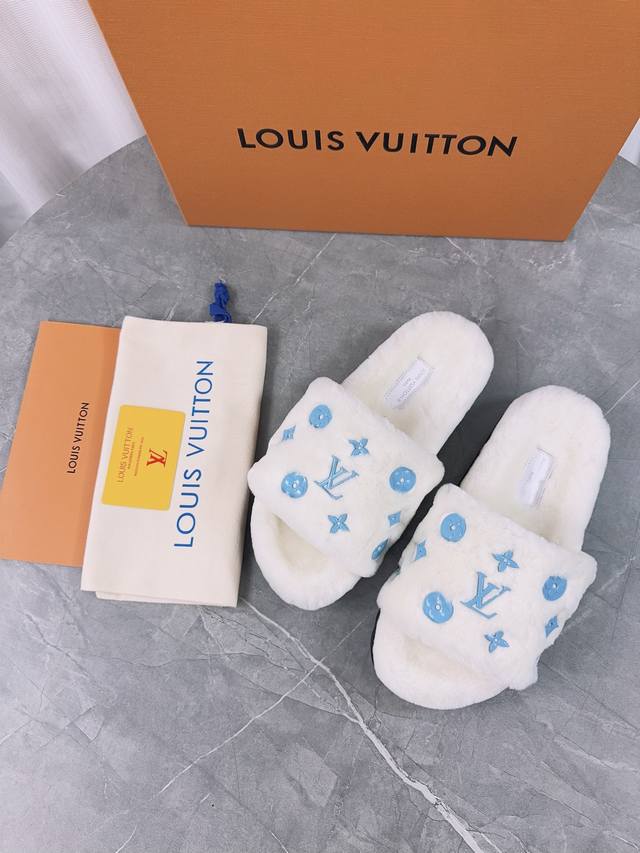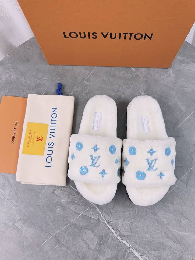 驴家Lv路易威登 爆款上市 Louis Vuitton 新款羊毛拖鞋细柔软羊毛 頂级品质纯皮毛一体直毛打造!超温暖的感觉,穿上仿佛踩在云朵上Lv经典老花装饰,精致高级!让这双毛拖身价陡增!鞋底是原版开模的Eva发泡防滑大底,非常好穿不打滑,而且鞋底有一定厚度,舒适度极佳! 鞋面:原版澳洲羊毛 内里:澳洲羊毛 垫脚:澳洲羊毛 大底:原版发泡底 底高:3.5Cm 包装:原版抽屉盒 码数:35-40 34 40 41定制不退换 颜色:官网同步色批: