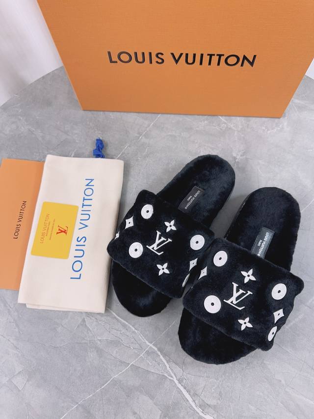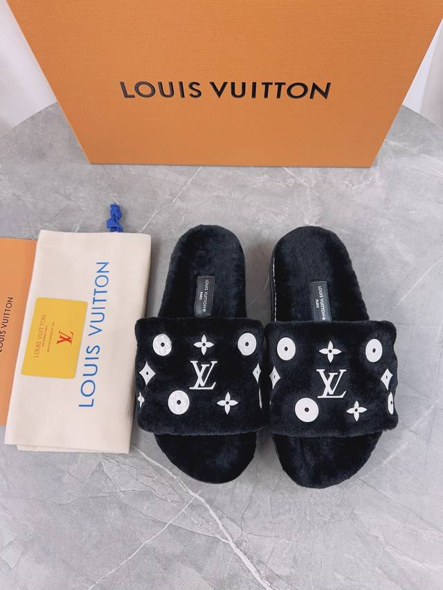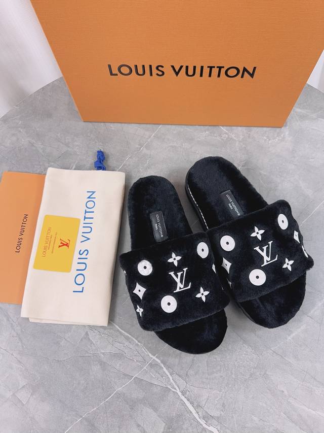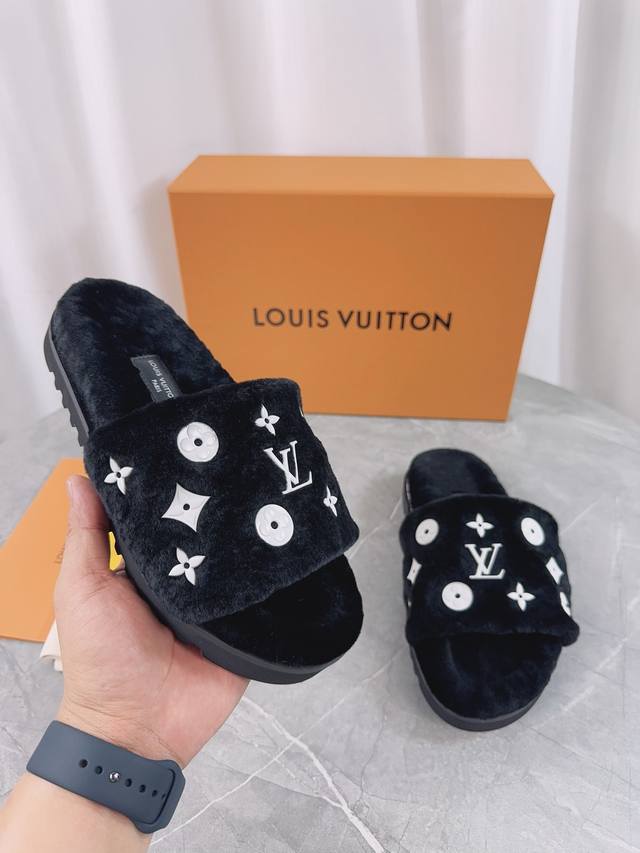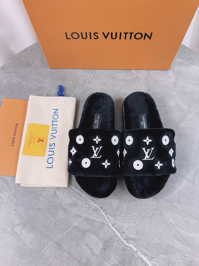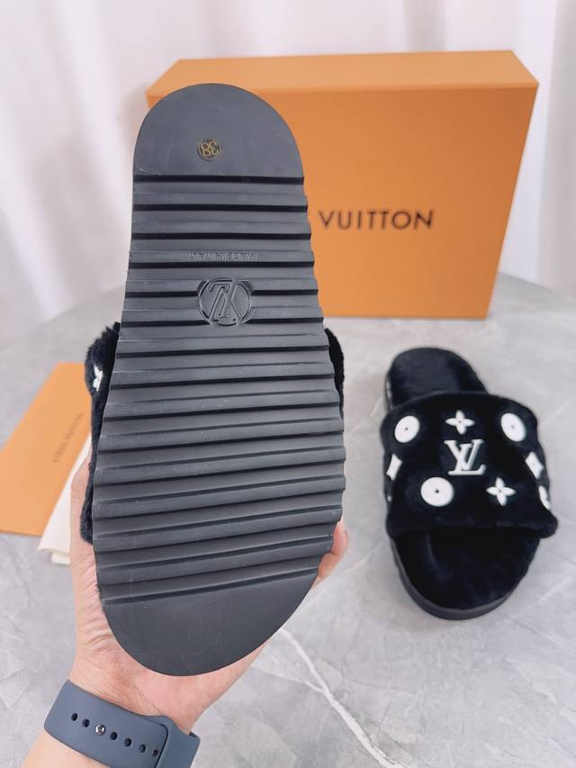 驴家Lv路易威登 爆款上市 Louis Vuitton 新款羊毛拖鞋细柔软羊毛 頂级品质纯皮毛一体直毛打造!超温暖的感觉,穿上仿佛踩在云朵上Lv经典老花装饰,精致高级!让这双毛拖身价陡增!鞋底是原版开模的Eva发泡防滑大底,非常好穿不打滑,而且鞋底有一定厚度,舒适度极佳! 鞋面:原版澳洲羊毛 内里:澳洲羊毛 垫脚:澳洲羊毛 大底:原版发泡底 底高:3.5Cm 包装:原版抽屉盒 码数:35-40 34 40 41定制不退换 颜色:官网同步色批: