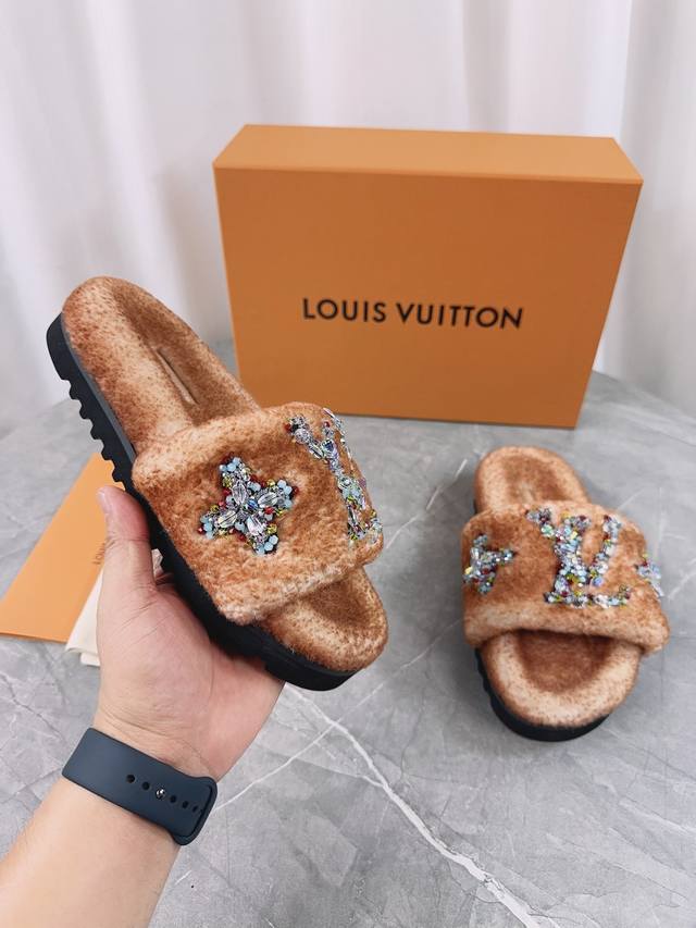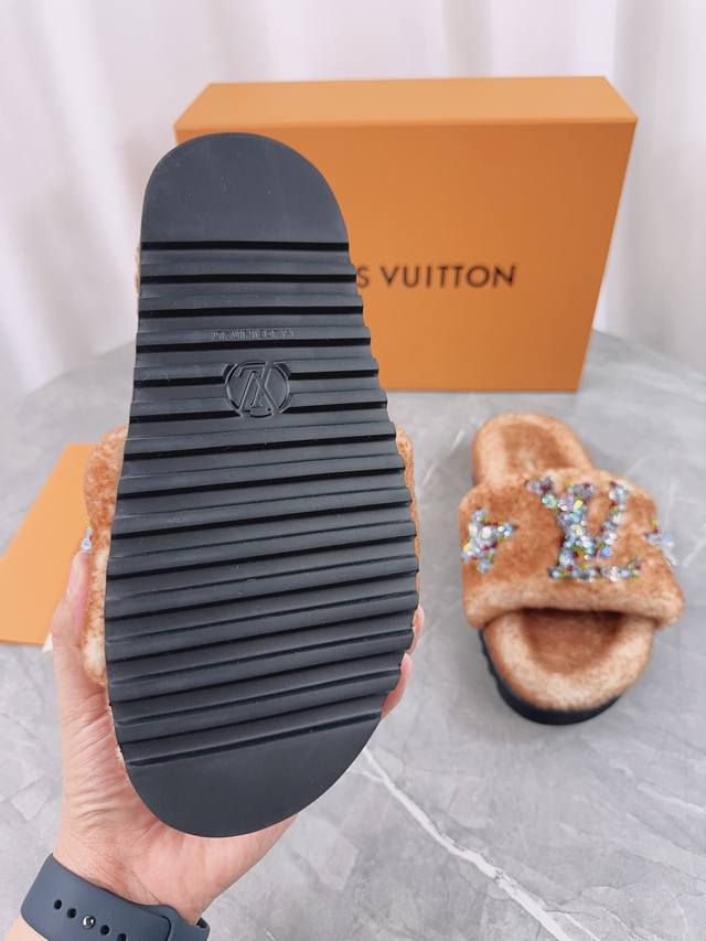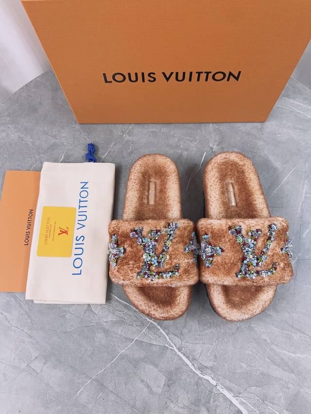 驴家Lv路易威登 爆款上市 Louis Vuitton 新款羊毛拖鞋细柔软羊毛 頂级品质纯皮毛一体直毛打造!超温暖的感觉,穿上仿佛踩在云朵上Lv经典老花装饰,精致高级!让这双毛拖身价陡增!鞋底是原版开模的Eva发泡防滑大底,非常好穿不打滑,而且鞋底有一定厚度,舒适度极佳! 鞋面:原版澳洲羊毛 内里:澳洲羊毛 垫脚:澳洲羊毛 大底:原版发泡底 底高:3.5Cm 包装:原版抽屉盒 码数:35-40 34 40 41定制不退换 颜色:官网同步色批: