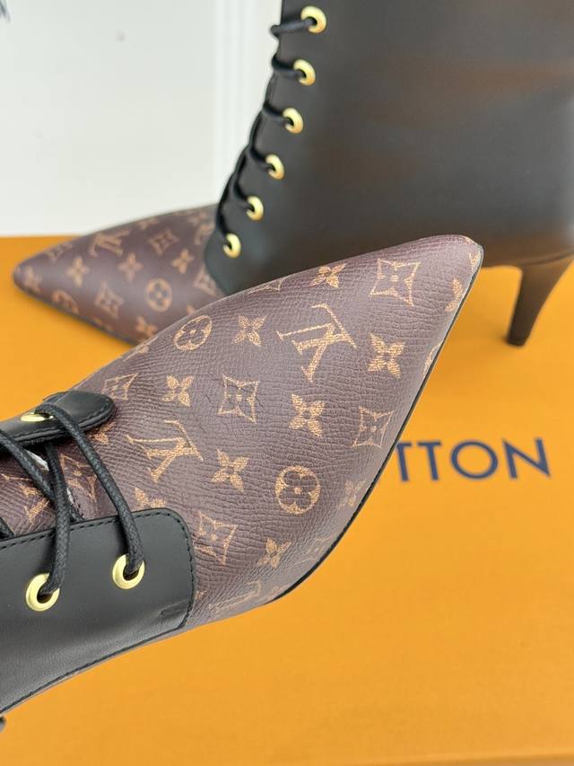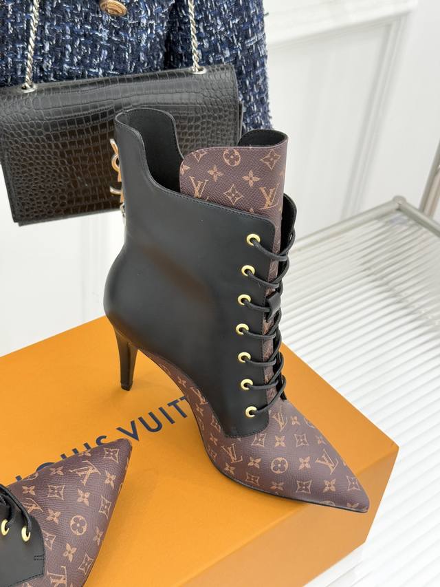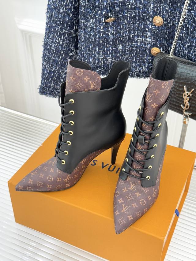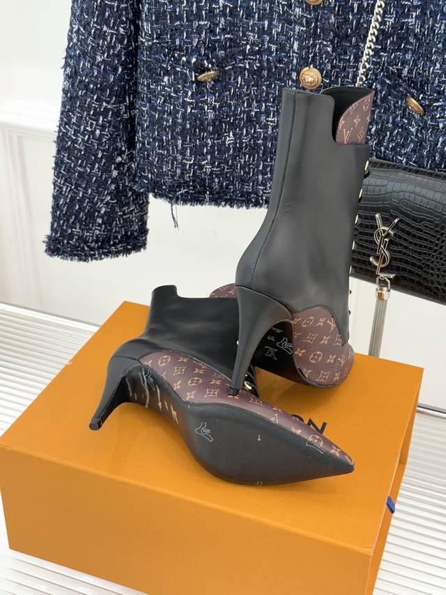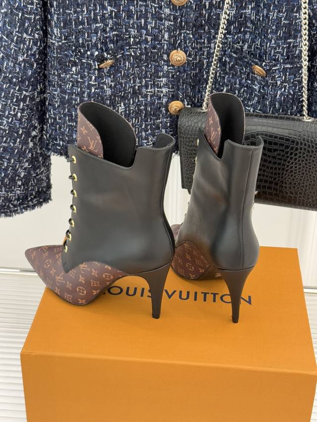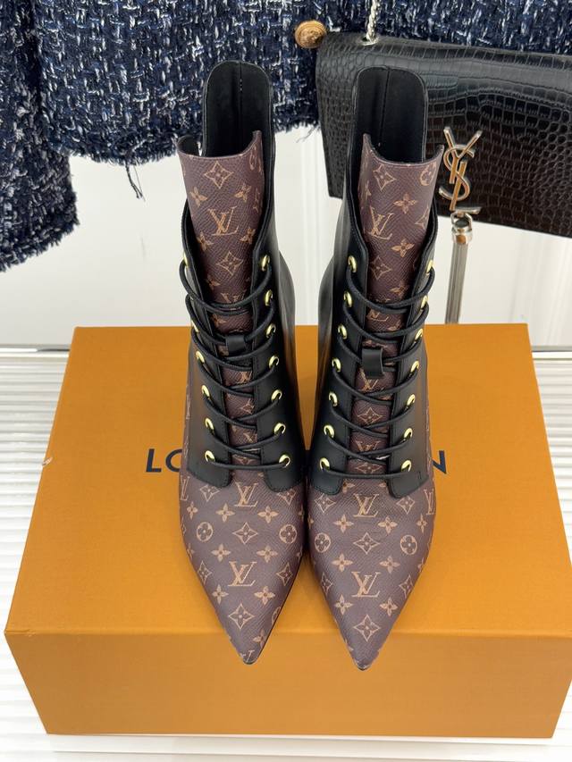 / 驴牌新品尖头老花高跟短靴 当百年老花邂逅当代鞋履美学 这款短靴以标志性符号与利落廓形 重塑优雅与锋芒的平衡, 让经典在步履间焕发新生。 面料采用原版定制皮料 内