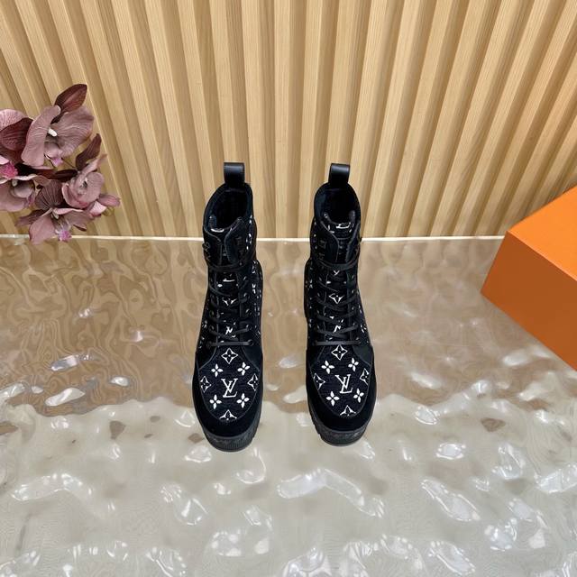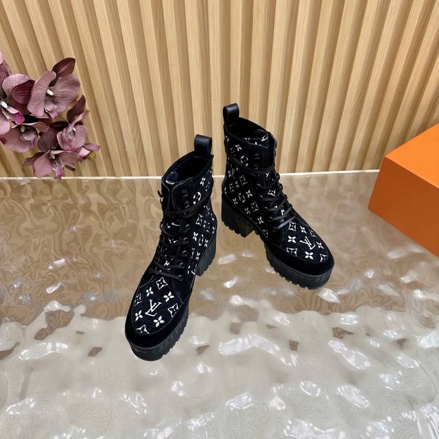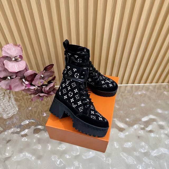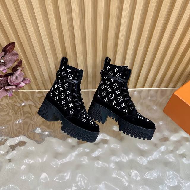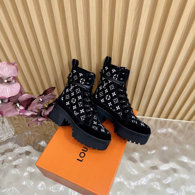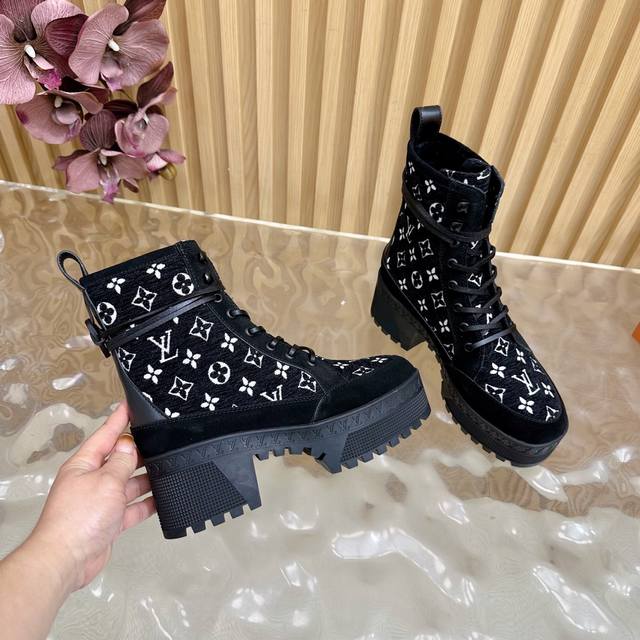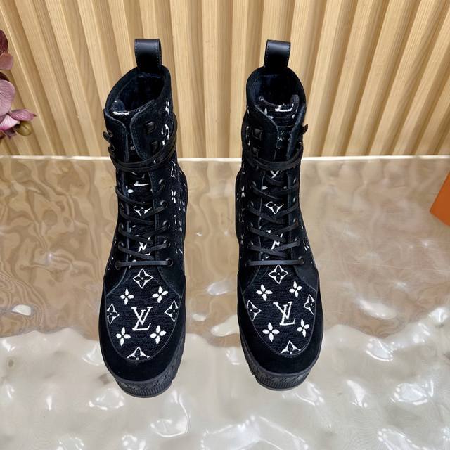 高版本Lv 驴牌经典高跟马丁靴沙地靴系列 DDD 绒里 DDD 原版一比一复刻 可对比细节 楦形 材料 大底等 鞋面牛皮 老花皮拼接 牛皮里 整条鞋带都是真皮切条 跟高7Cm水台3.5Cm 大气显瘦增高 好走不累脚 码数:35-40码 40、41定制 DDD
