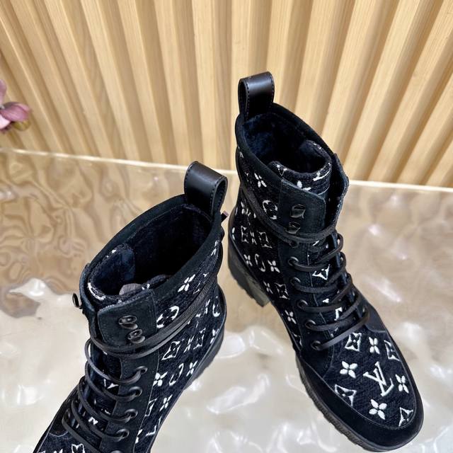 高版本Lv 驴牌经典高跟马丁靴沙地靴系列 绒里 原版一比一复刻 可对比细节 楦形 材料 大底等 鞋面牛皮 老花皮拼接 牛皮里 整条鞋带都是真皮切条 跟高7Cm水