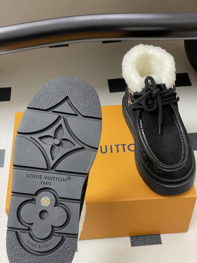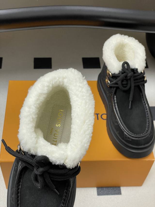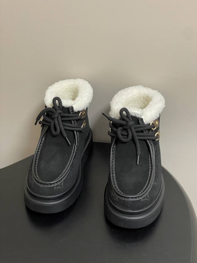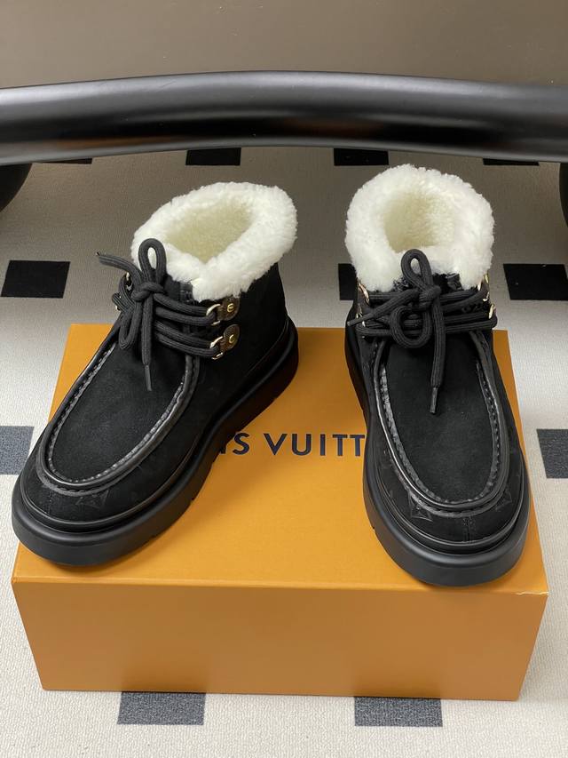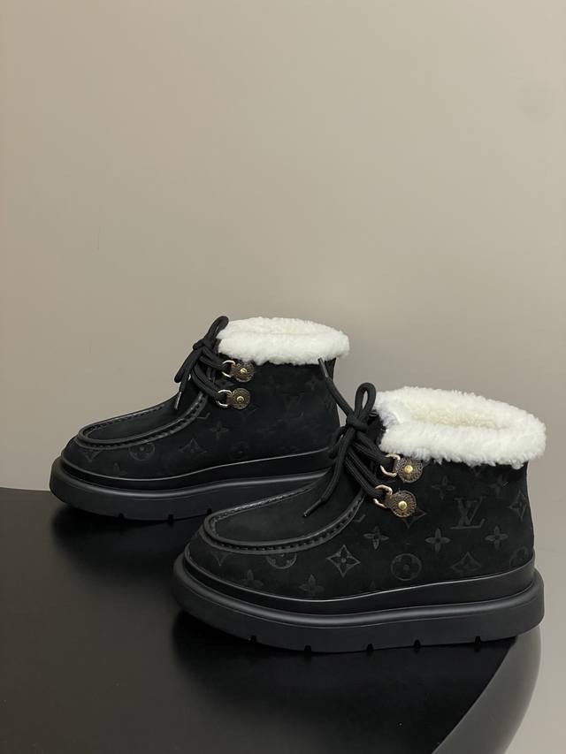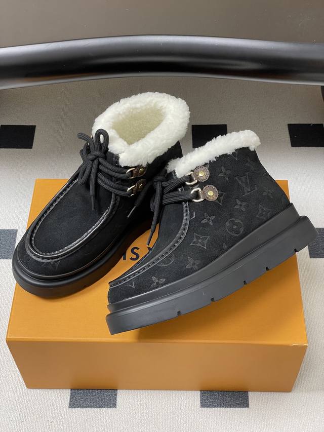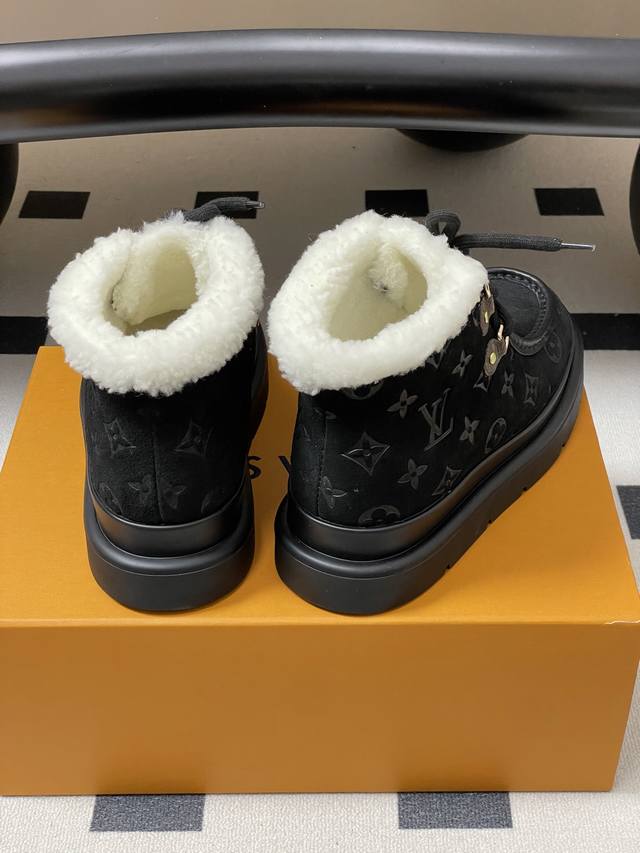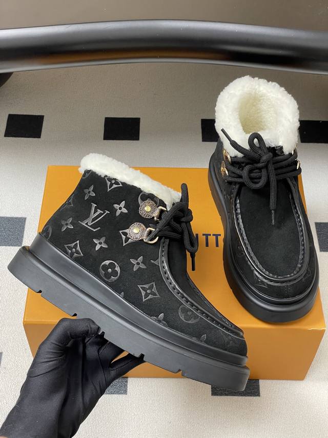 25Ss秋冬新款Louis Vuiteeon Lv 字母压花系带厚底雪地靴羊毛及踝靴短靴 DDD 本款 Cortina 及踝靴出自Lvski系列,将绒面牛皮革鞋面与舒适羊毛皮内衬融于一体。Monogram图案鞋面与点缀Lv Circle标识的皮革鞋带构筑考究细节。搭配防滑橡胶外底,可于冬日假期与都市生活间无缝切换。 DDD 鞋面:高丝光牛反绒 DDD 内里垫脚:羊毛 DDD 鞋底:原版开模Tpu橡胶大底 DDD 跟高:5Cm DDD 码数:35-39 40.41定做不退换 DDD