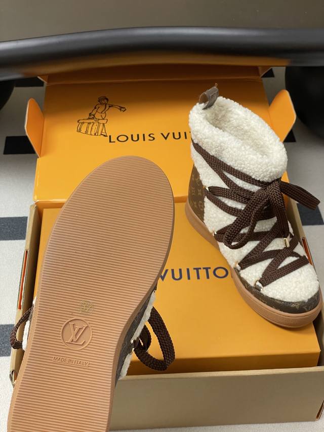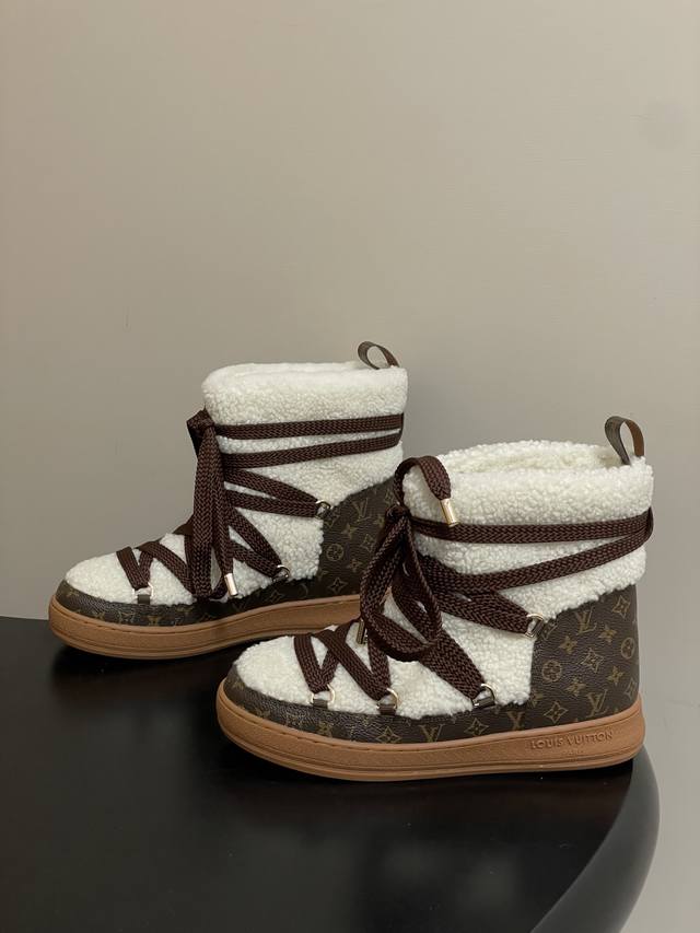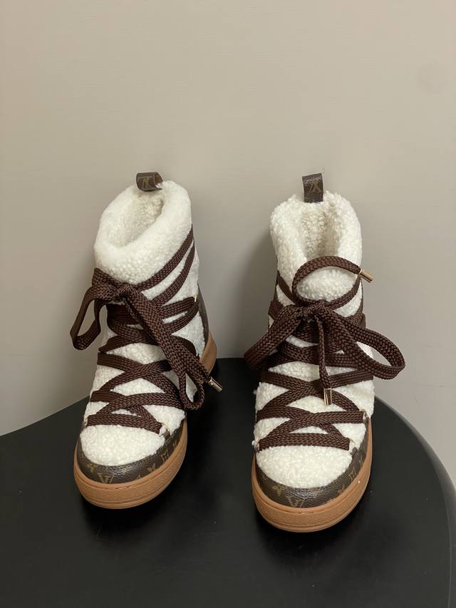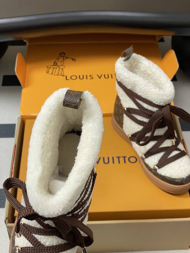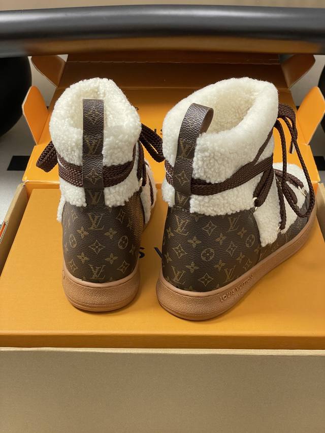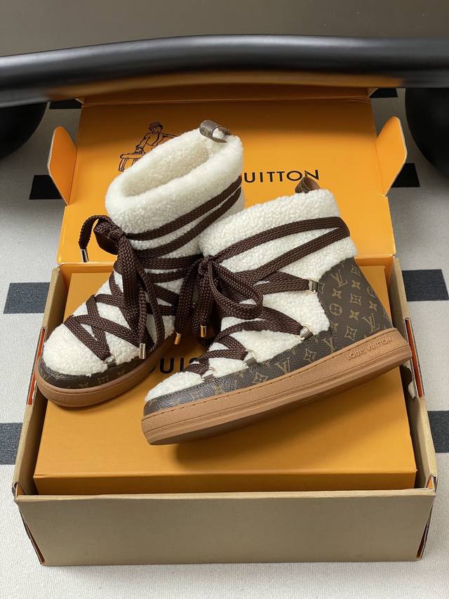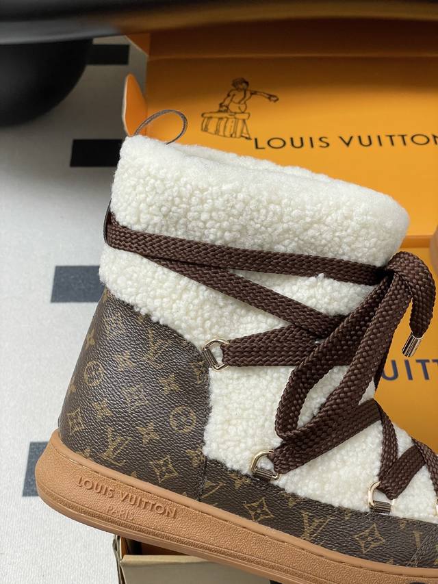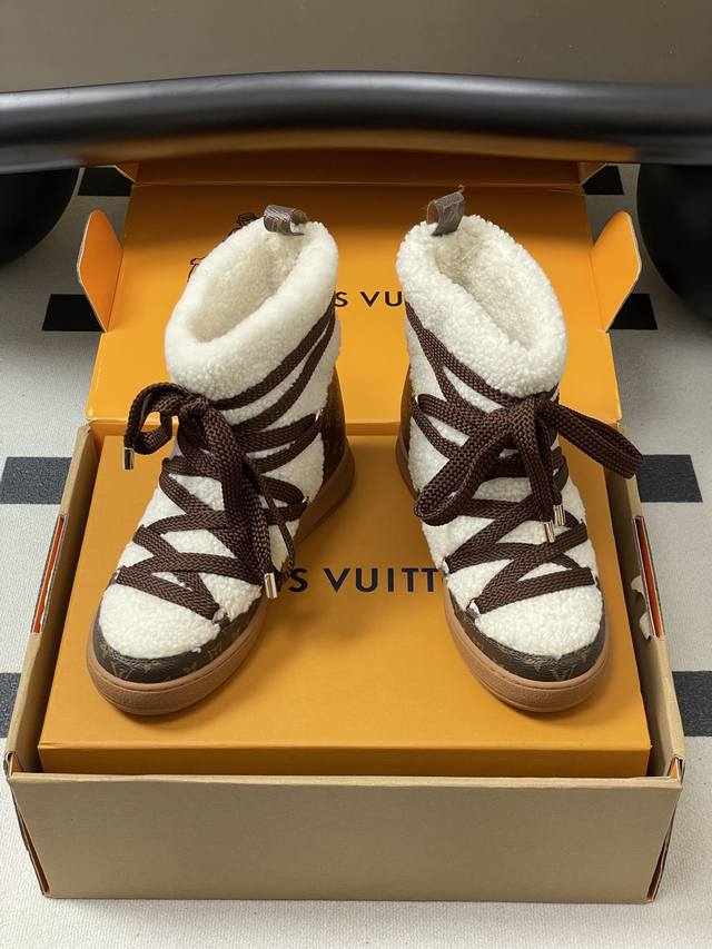 25Ss秋冬新款Louis Vuiteeon Lv Cloud 系带高帮羊毛运动鞋 经典老花皮系带厚底雪地靴羊毛及踝靴短靴 DDD 本款 Lv Cloud 系带高帮运动鞋以舒适羊毛皮及经典Monogram帆布构筑舒暖瞩目构型,为Lvski系列再添潮流一员,可在雪道运动与城市街头间无缝切换。交叉鞋带点缀亮泽孔眼,橡胶外底抒写路易威登标识。可于冬日假期与都市生活间无缝切换。 DDD 鞋面:定制老花皮 羊羔毛 DDD 内里垫脚:羊毛 DDD 鞋底:原版开模Tpu橡胶大底 DDD 码数:35-39 40.41定做