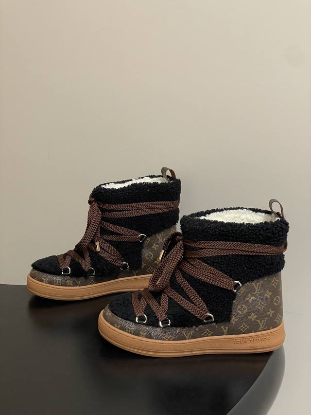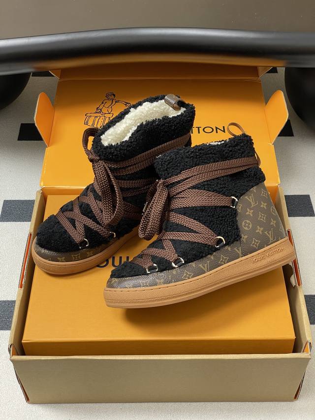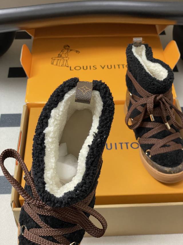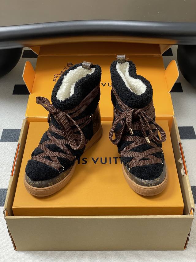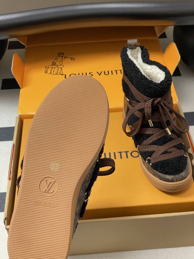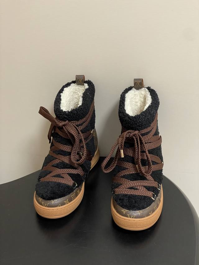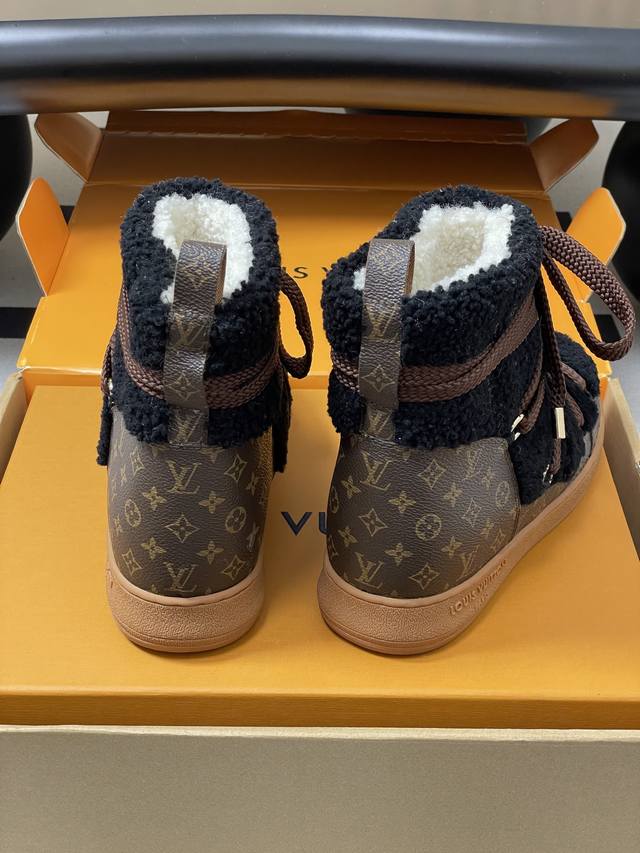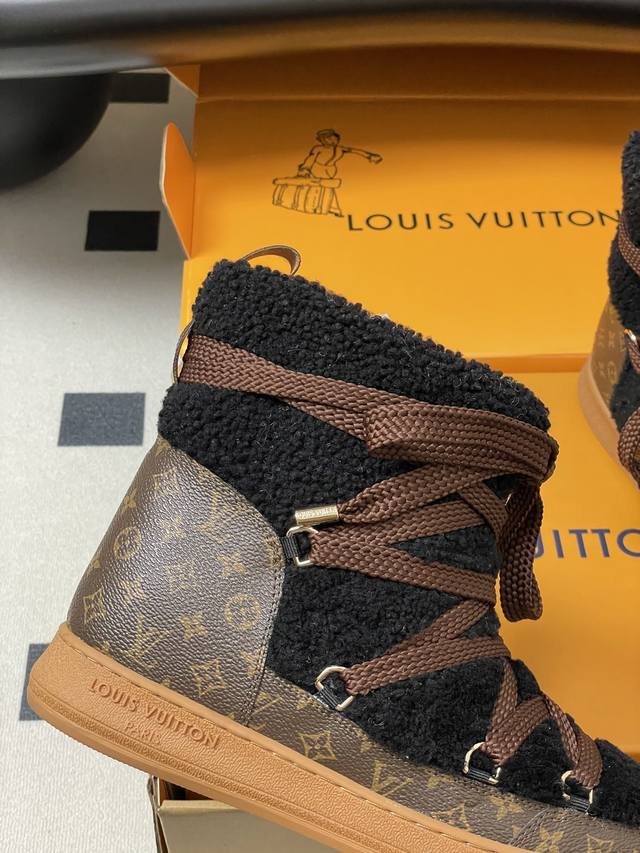 25Ss秋冬新款Louis Vuiteeon Lv Cloud 系带高帮羊毛运动鞋 经典老花皮系带厚底雪地靴羊毛及踝靴短靴 DDD 本款 Lv Cloud 系带高帮运动鞋以舒适羊毛皮及经典Monogram帆布构筑舒暖瞩目构型,为Lvski系列再添潮流一员,可在雪道运动与城市街头间无缝切换。交叉鞋带点缀亮泽孔眼,橡胶外底抒写路易威登标识。可于冬日假期与都市生活间无缝切换。 DDD 鞋面:定制老花皮 羊羔毛 DDD 内里垫脚:羊毛 DDD 鞋底:原版开模Tpu橡胶大底 DDD 码数:35-39 40.41定做