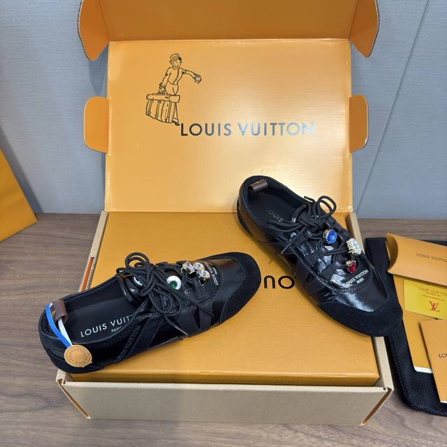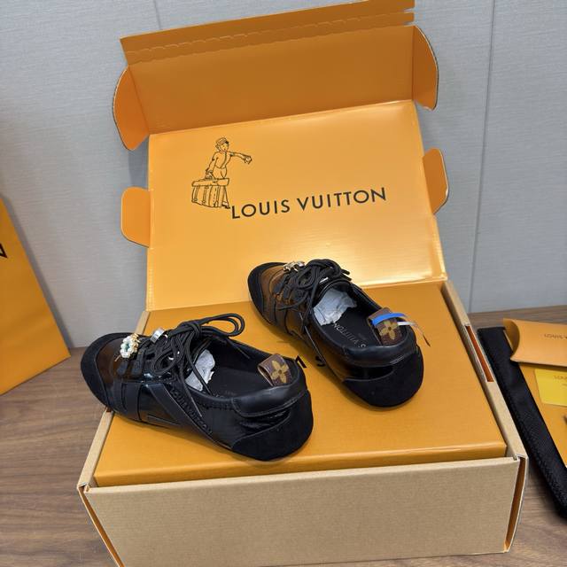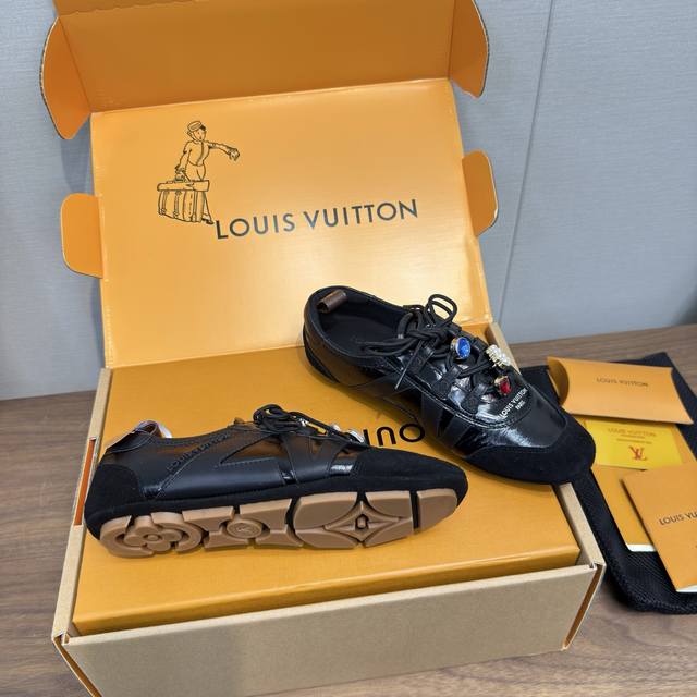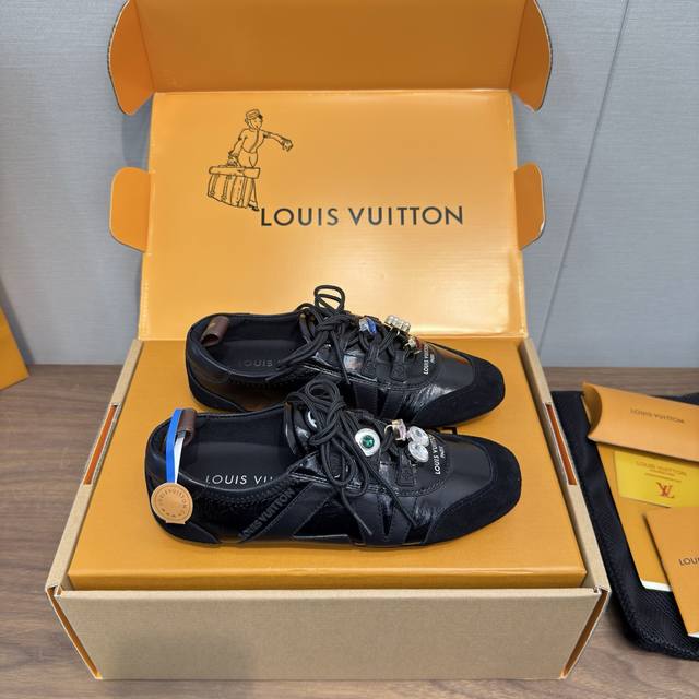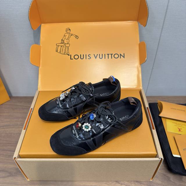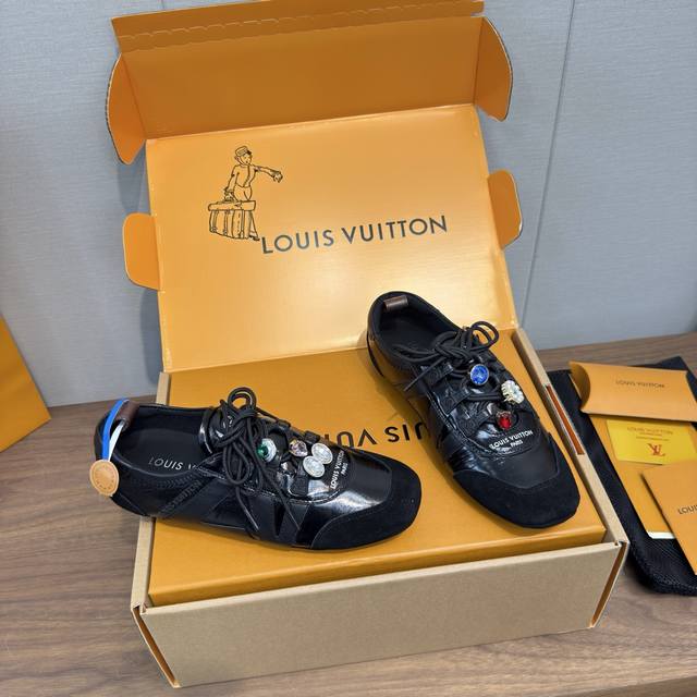 Louis Vuitton路易威登驴牌春夏Sneakerina系列 芭蕾运动鞋 德训鞋 休闲便鞋 情侣款 DDD 高版本包装 配饰扣70 DDD 完美复刻Sneakerina 芭蕾风运动鞋以丝滑绒面牛皮革塑造流畅线条 兼具芭蕾舞鞋的轻盈构型和运动鞋的舒适质感。 DDD 侧面 Lv 标识和Monogram 帆布后袢带丰富细节,Sacchetto 工艺和 Tpu 外底升级轻柔穿着体验 DDD 底厚:1.5Cm 面料: 原版定制进口头层牛皮 内里:原版定制透气网里鞋底:原版开模注塑Tpu材质 DDD 码数:女3