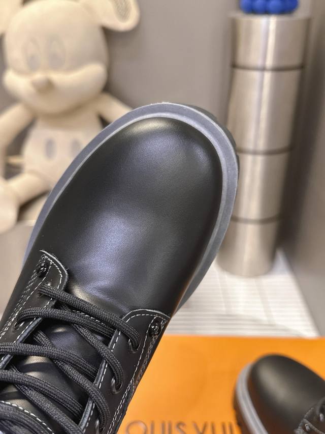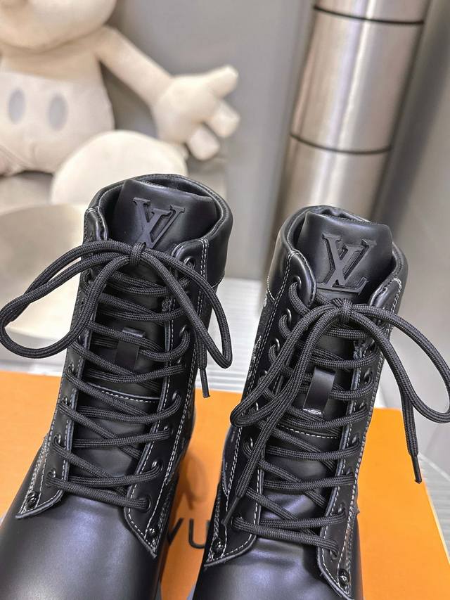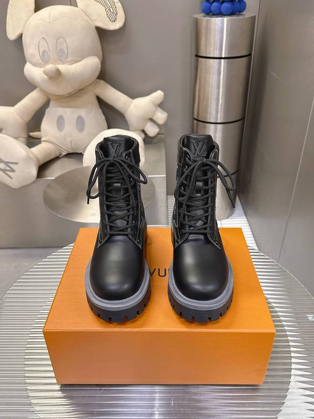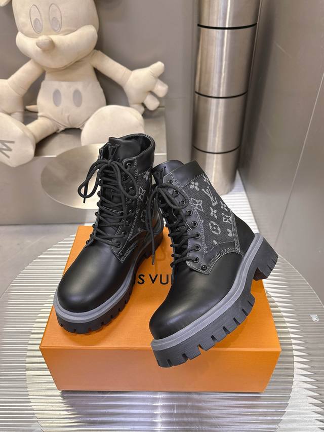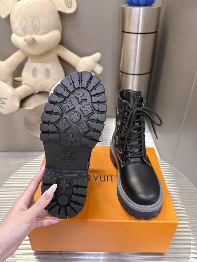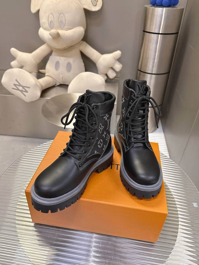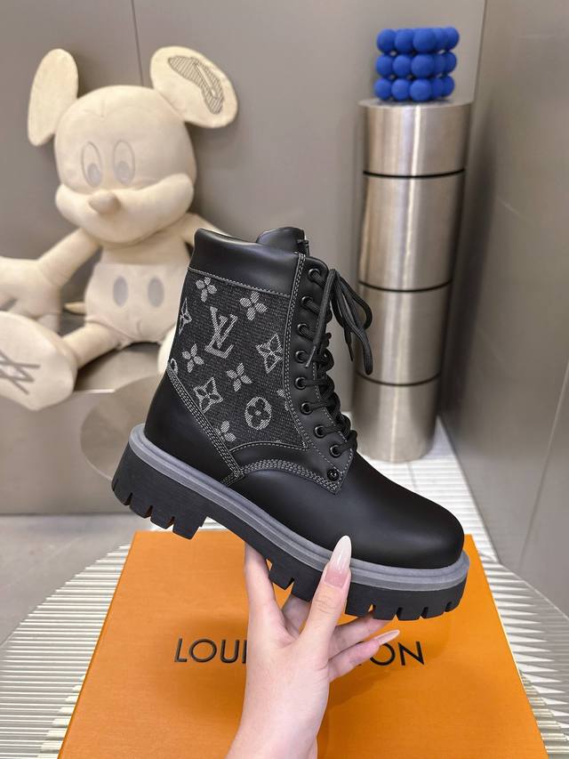 Louis Vuitton 路易威登牛皮拼牛仔印花系高帮厚底马丁靴 冬天必备女款,码数:35-40 #V马丁靴 #Lv平底马丁靴 #V短靴 #V厚底短靴