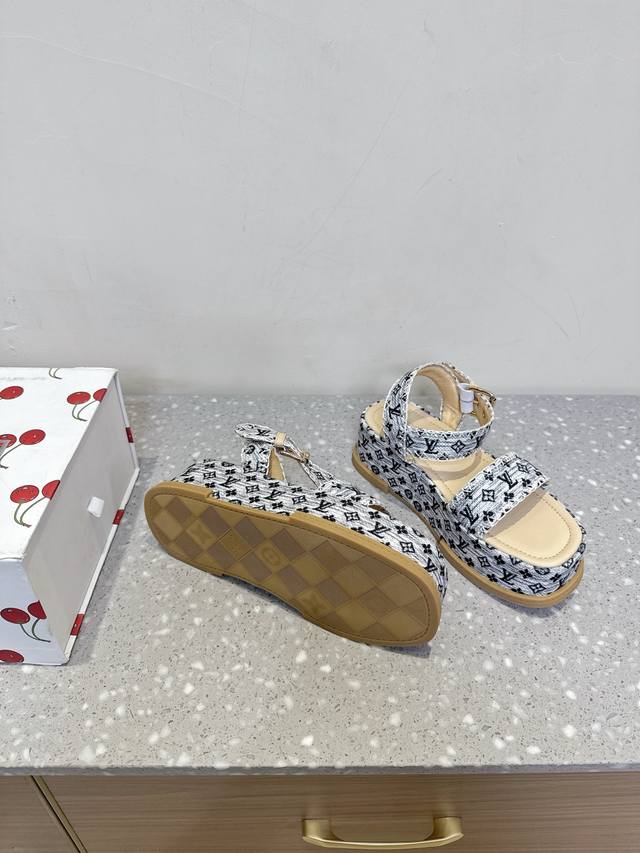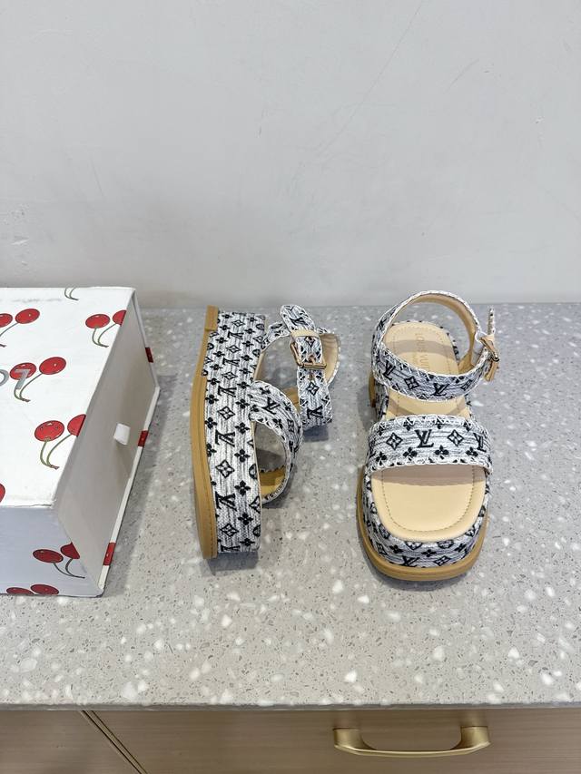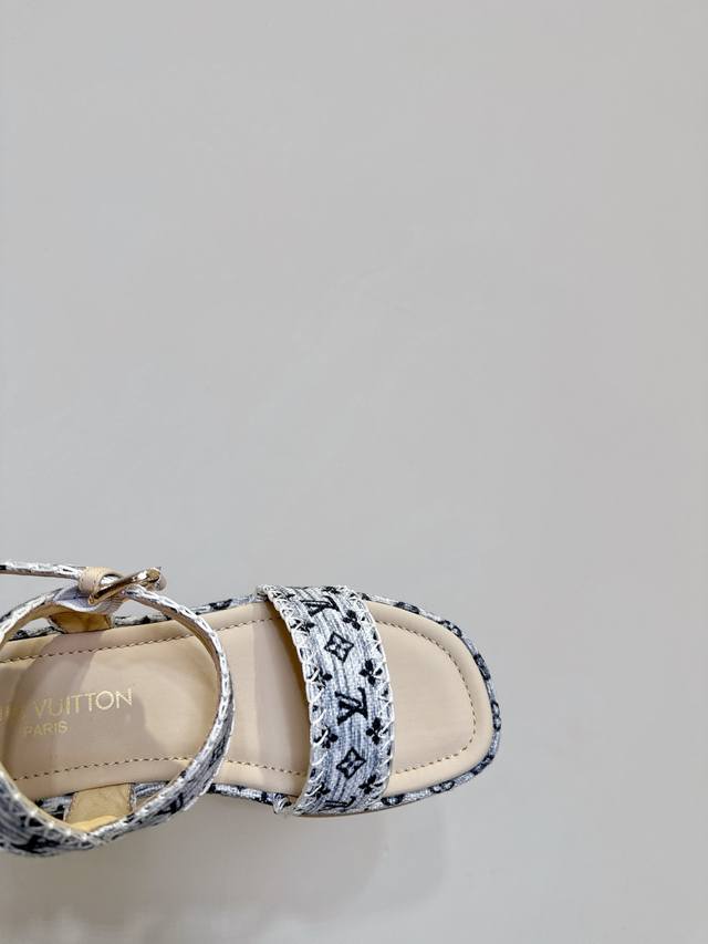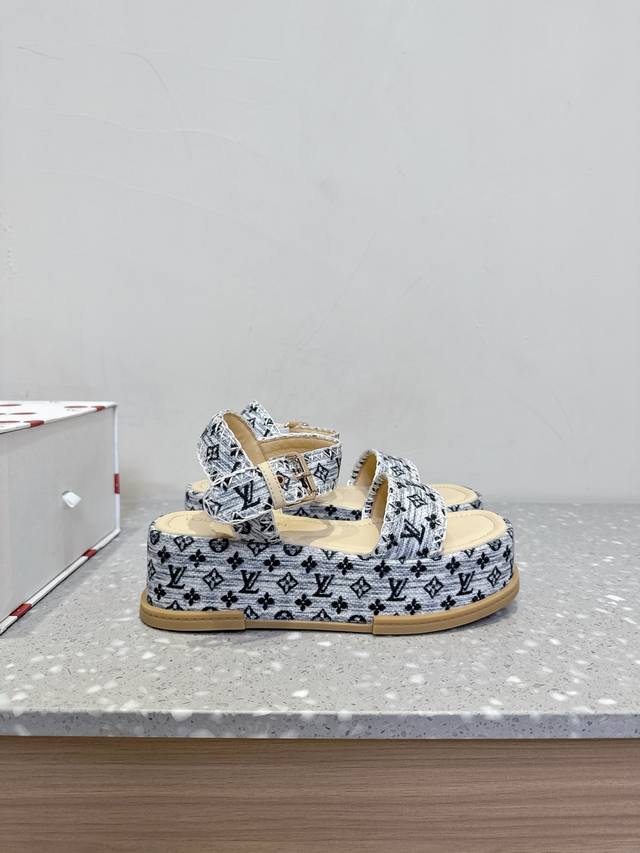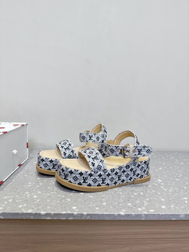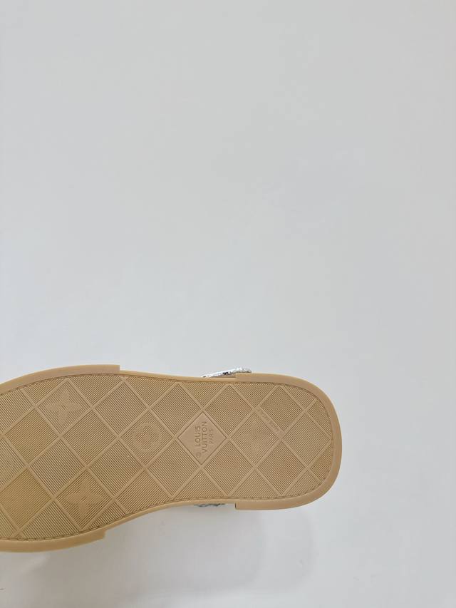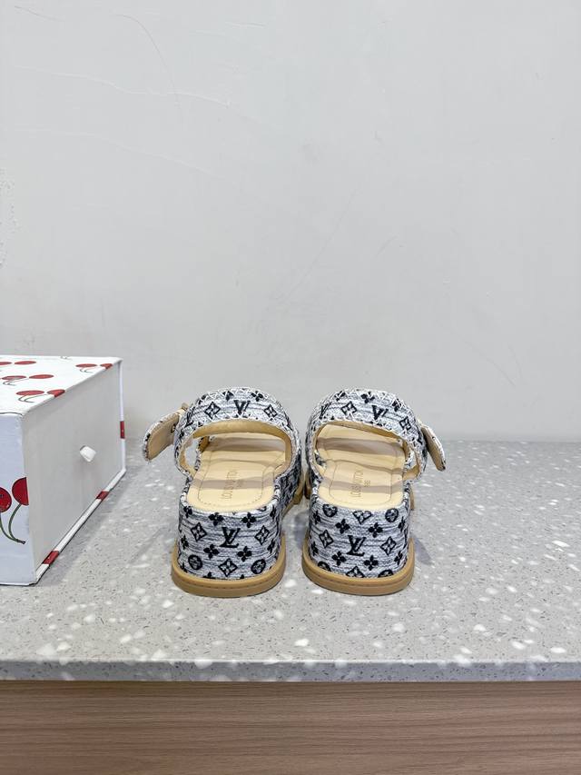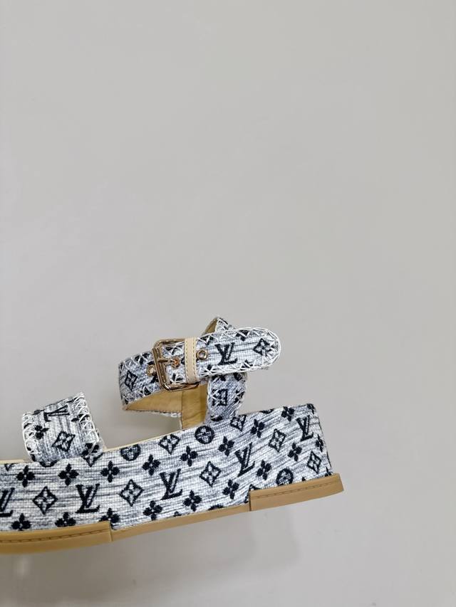 本款 Maya Platform 帆布便鞋拼接 Monogram 提花织纹鞋面与舒适麻绳编织防水台,援引经典帆布便鞋设计。几何形状Lv 字母与 Monogram花卉装点鞋面,撞色皮革后带由耀目搭扣收束。