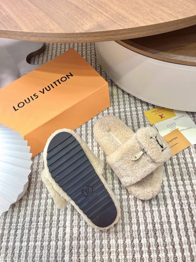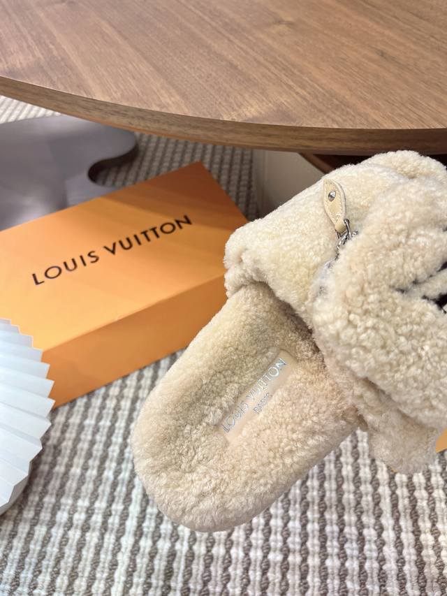 / Louis Vuitton 2025 秋冬新款时尚魔术贴拉链包羊羔毛女拖鞋 Lv字母Logo平底圆头拼色露趾居家鞋 鞋面:进口100%羊羔毛 大底:原版开模防滑