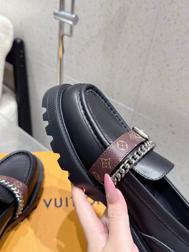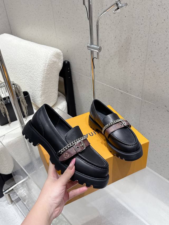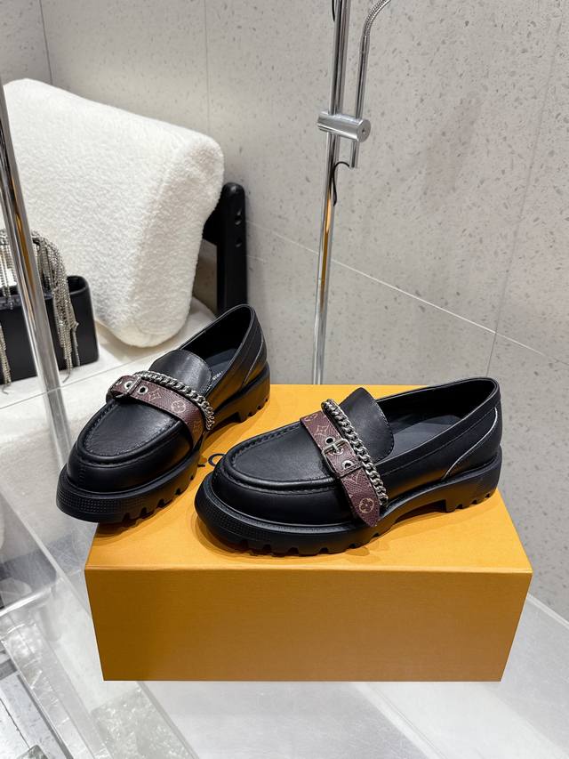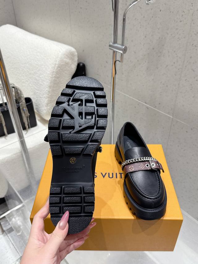Louis Vuitton 25Ss秋冬新款 Lv 老花皮带链条厚底乐福鞋 单鞋 皮鞋 鞋面:牛皮 老花皮 内里垫脚:牛皮 鞋底:原版开模定制橡胶大底 码数:女