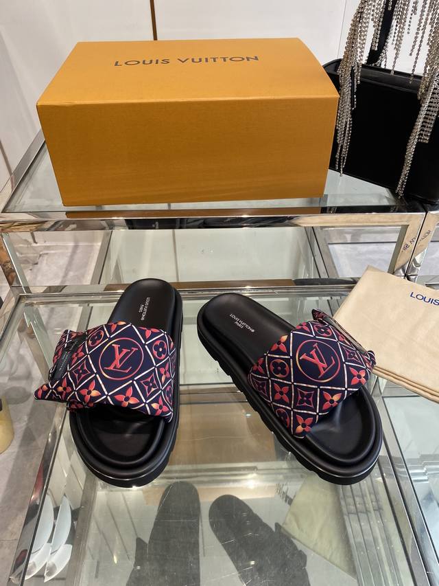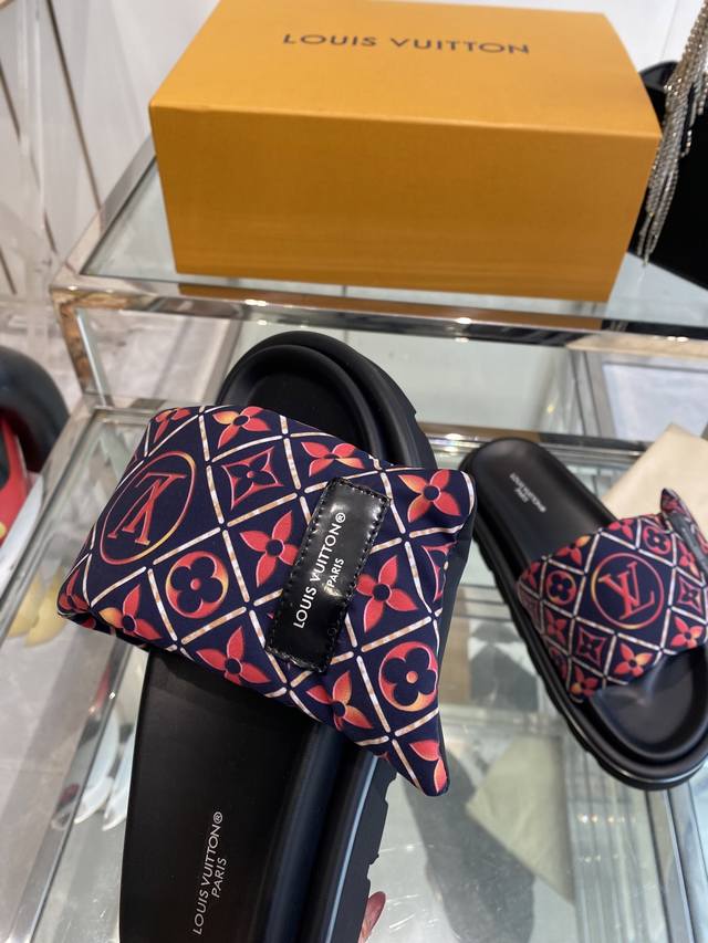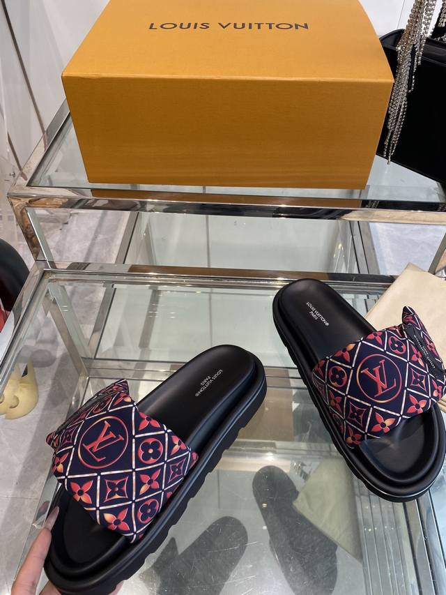 Louis Vuitton 25Ss 夏季新款凉拖 魔术贴 可调松紧的设计 满满的沙滩风情 原版开模Lv金属 Logo装饰鞋面 定制进口提花布料原版老花皮料 水染羊皮内里三层组合大底 水台+耐磨绒+橡胶底 码数:35-46 女40 男45.46定做
