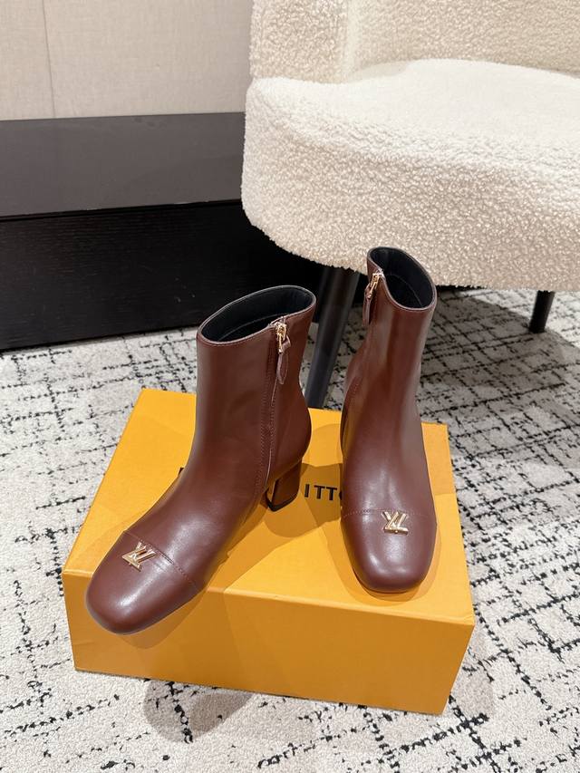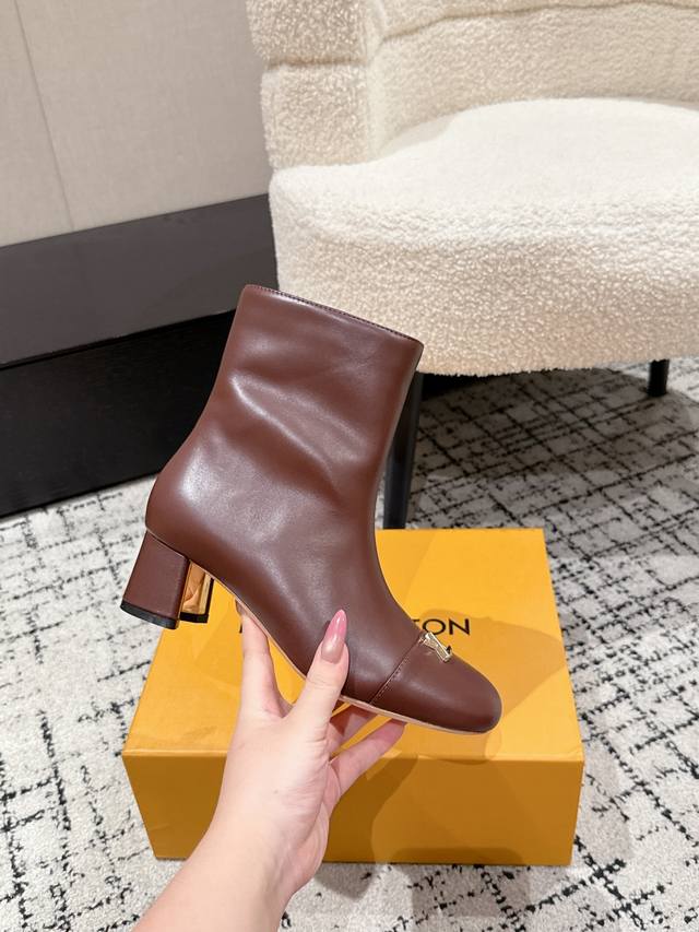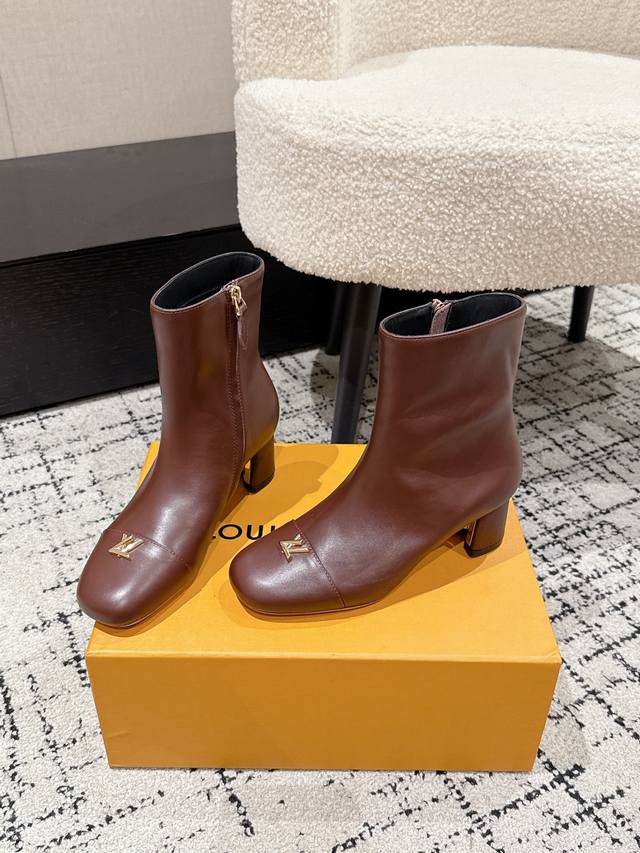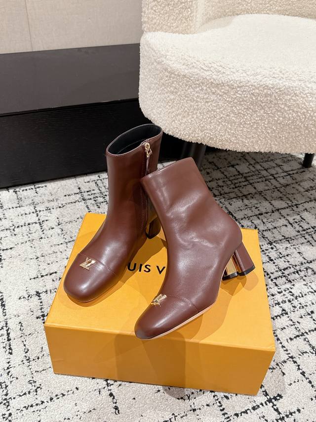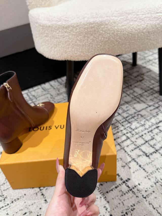 Louis Vuitton Lv 25 秋冬最新 Swing 高跟短靴 侧拉链短靴字母扣及踝靴 选用柔软 皮革塑造易于穿脱的设计,以利落线条彰显典雅风范。V形镂空方跟及其莹泽内里树立辨识度,鞋头Lvtwist装饰点睛考究细节 可爱的圆头造型搭配Lv标志-精致又好看,粗跟脚感特别的好穿舒适。经典百搭单品! 原版开模V型金跟! 鞋面:进口小牛皮 内里:羊皮 鞋底:意大利A级真皮大底 跟高:5.5Cm Size:#35-41 40.41定做不退换