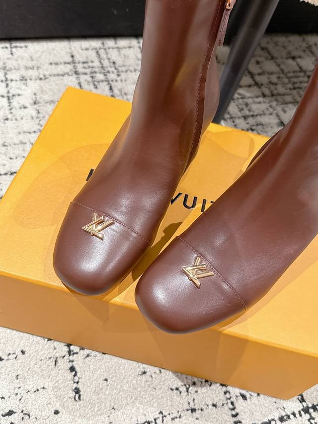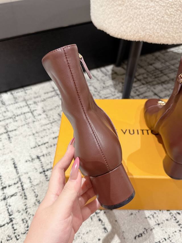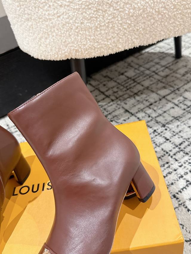 Louis Vuitton Lv 25 秋冬最新 Swing 高跟短靴 侧拉链短靴字母扣及踝靴 选用柔软 皮革塑造易于穿脱的设计,以利落线条彰显典雅风范。V形镂