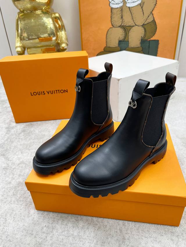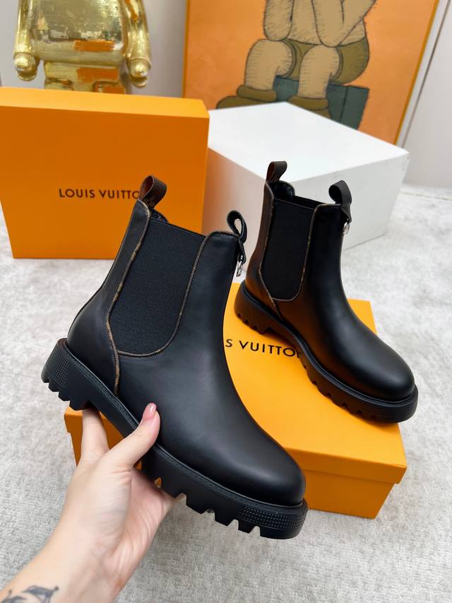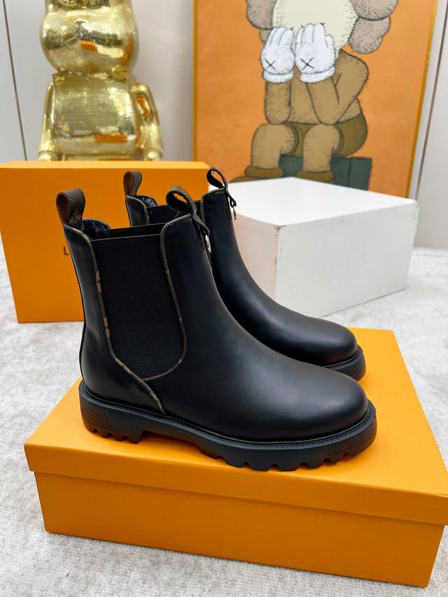 Lous Vuiton 路易威2025官网最新短靴款,官网原版一比一。 Lv Beaubourg 采用小牛皮呈现切尔西风格鞋面,搭配轻盈厚底,更有 Monogram 帆布镶边和撞色缝线分别勾勒弹力侧围和贴缝,巧妙演绎刚柔并济。是一款舒适大方,上脚百搭而又非常好看的时尚短靴。 鞋面:全粒面小牛皮。 内里垫脚:羊皮。 颜色:黑色 咖色 35至40码, 414243码可以定做不退换 出厂价Pp: 元 欢迎各位老板下单!