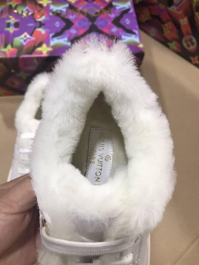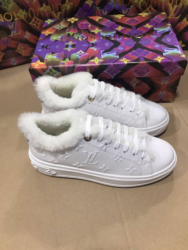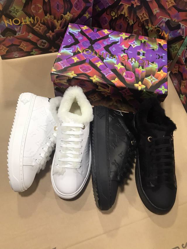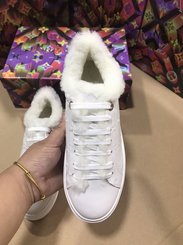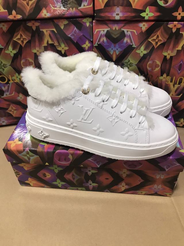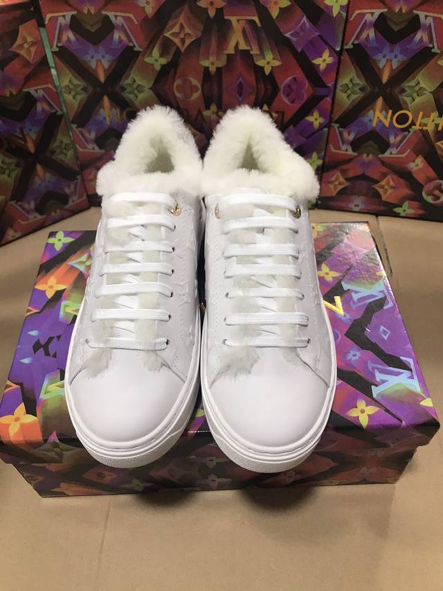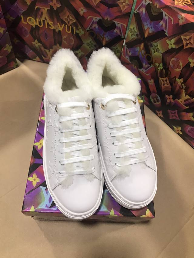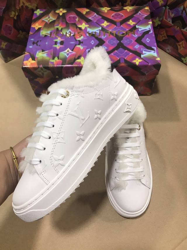 Lv休闲毛毛鞋,Time Out 运动鞋以小牛皮包裹舒软羊毛内衬,直面寒冷时节。柔软鞋面压印品牌经典 Monogram 图案,后侧 Monogram 帆布饰边和标志性加厚外底释放潮流魅力。 DDD 面料:头层小牛皮,内里垫脚羊毛.两色:黑色、白色尺码:35-40. 34、41、42可以定做 DDD