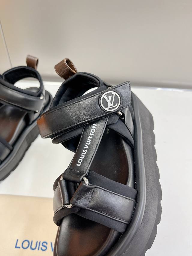 Lv凉鞋 驴家25最新款高端时尚百搭款 非常包脚 非常好穿 厚底增高显瘦凉鞋, 凉鞋以柔软羊皮革塑造潮流动感格调。搭配可调节魔术贴鞋带与 Lv 标识。6厘米微型平底厚实而不失轻盈
