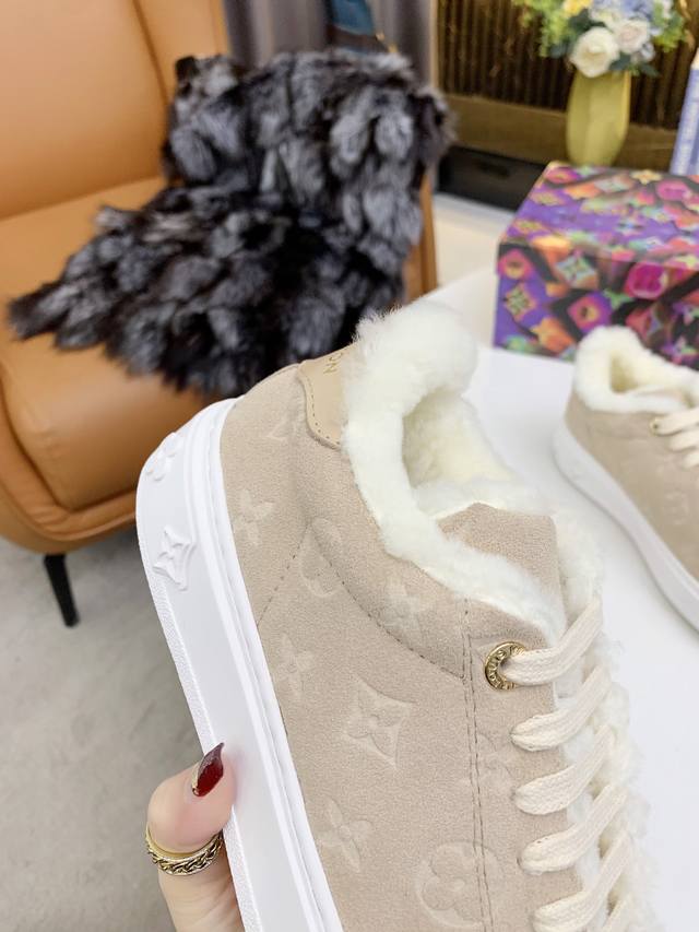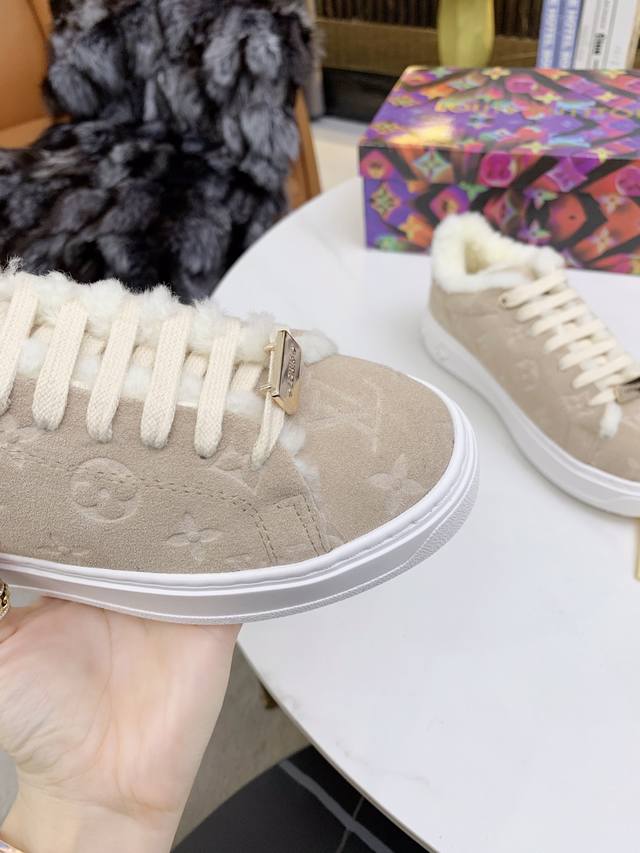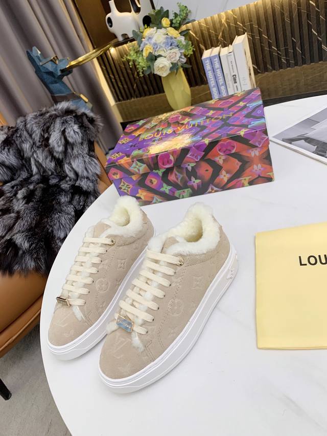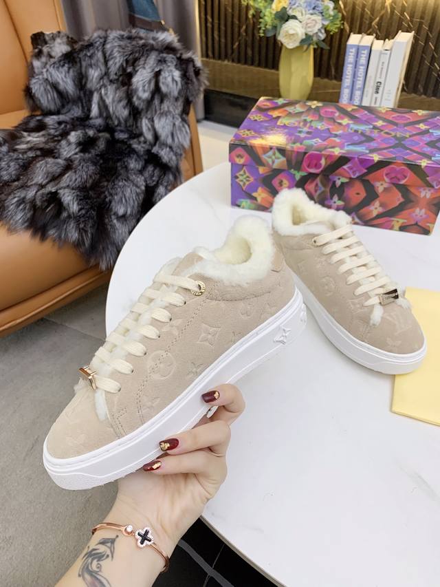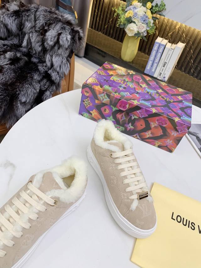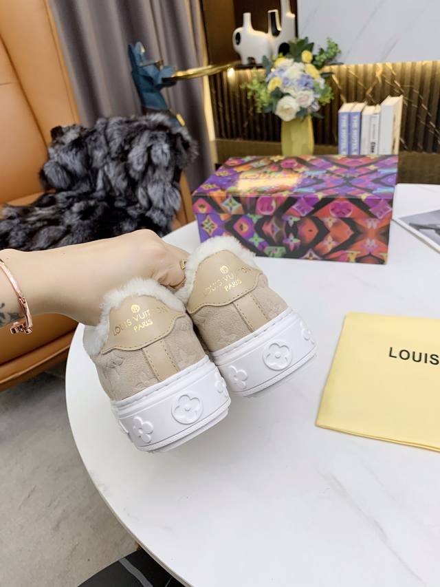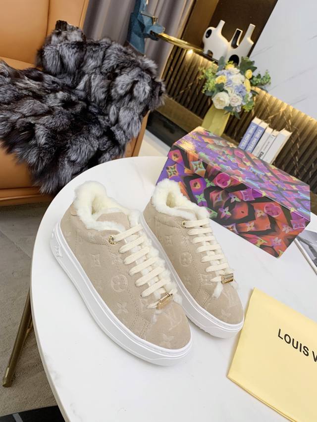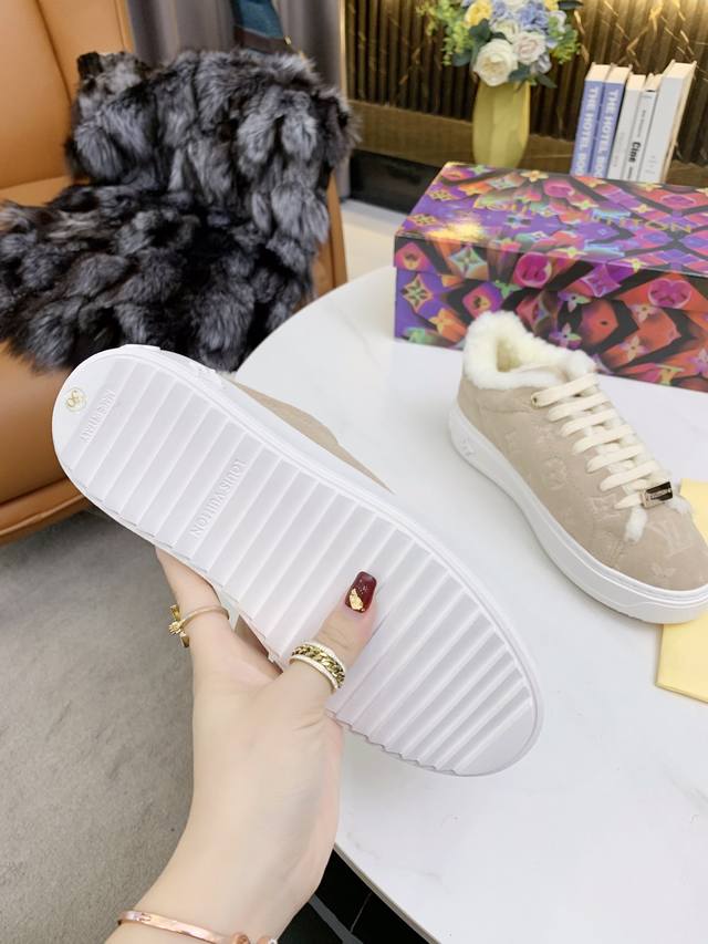 Lv本款 Time Out 运动鞋为小牛皮制成的麂皮压印 Monogram 图案,以舒软羊毛内衬围裹融融暖意。加厚橡胶外底呼应鞋面设计,点缀铭纹孔眼和后部的路易威登标识压纹,3个颜色可选!尺码:女款35-42. 42订做 男款38-45. 45订做 DDD