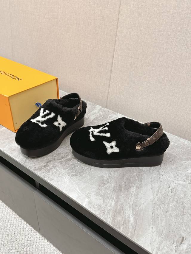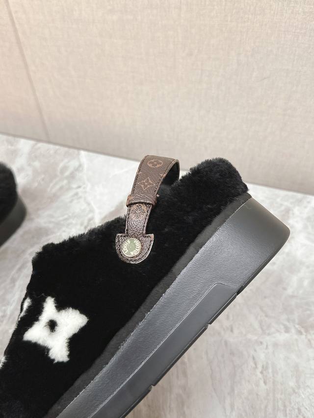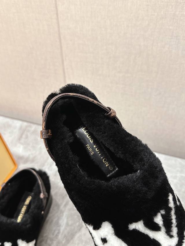 / Lv路易威登最新款秋冬新款纯羊毛拖厚底增高外穿羊毛拖 半包羊毛拖后跟附带固定扣小个子必入款 增高显瘦 精致高级 慵懒又不乏高级感,毛茸茸的太可爱了!鞋面、内里、