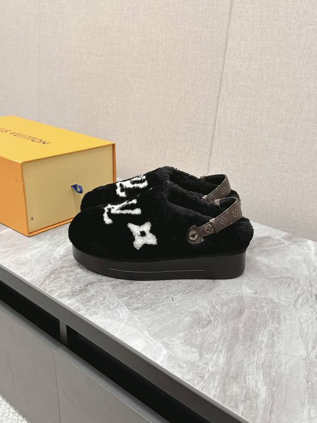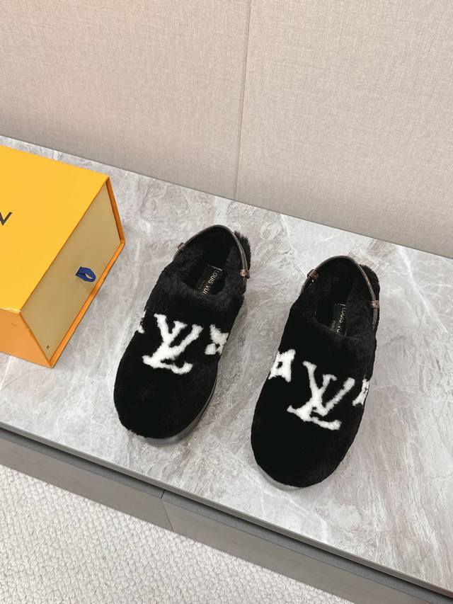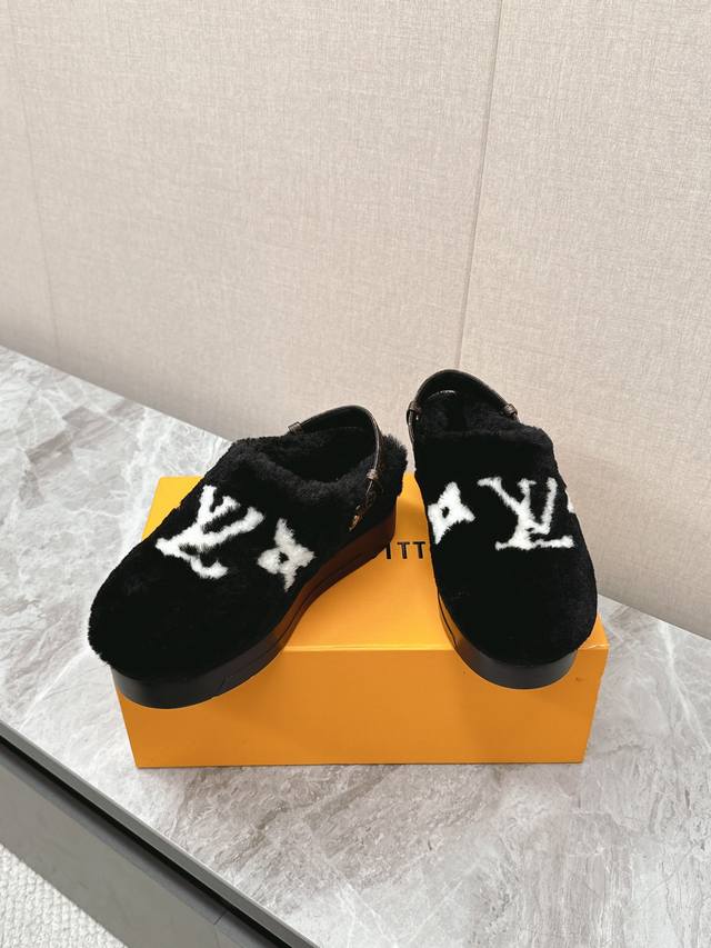 FFF Lv路易威登最新款秋冬新款纯羊毛拖厚底增高外穿羊毛拖 半包羊毛拖后跟附带固定扣小个子必入款 增高显瘦 精致高级 慵懒又不乏高级感,毛茸茸的太可爱了!鞋面、内里、垫脚采用全真羊毛,保暖舒适的同时质感拉满 码数:35-41 DDD