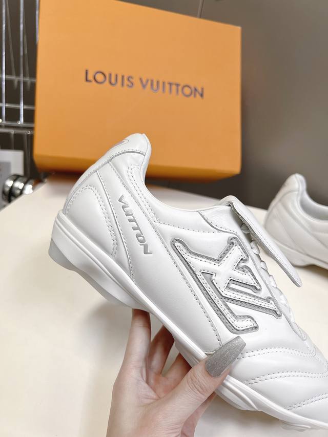 Lv路易威登最新Footprint系列 情侣款足球运动鞋 DDD 原版购入开发 做货 这款 Footprint Soccer 运动鞋于2025春夏系列时装展中亮相,是pharrell Williams 首次以足球鞋为灵感设计的运动鞋。鞋款的灵感来自跨越世代和文化的足球运动,呼应2025春夏系列时装展团结一致、全民参与的主题。鞋款以流丽的设计著称,侧面以富动感的Iv Initials标志点缀,鞋舌缀有灵感来自足球队伍的Lvers United徽章,而脚掌纹橡胶鞋底饰有多款路易威登标志 DDD 配送专柜精美包
