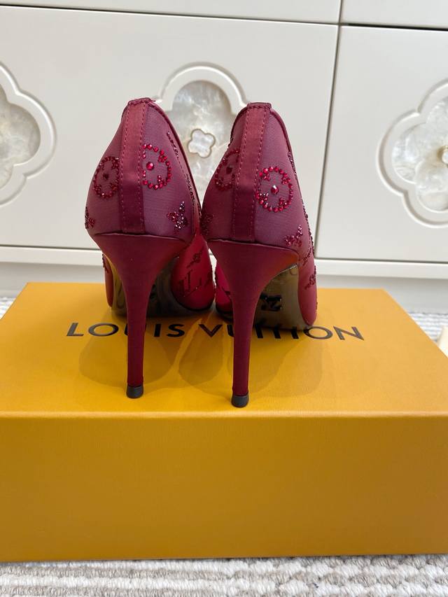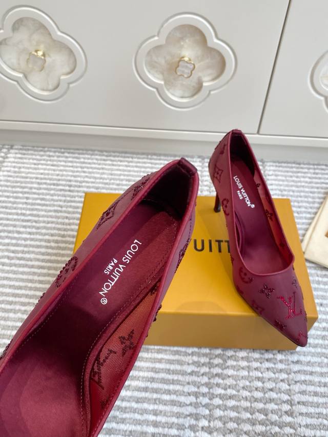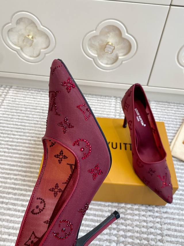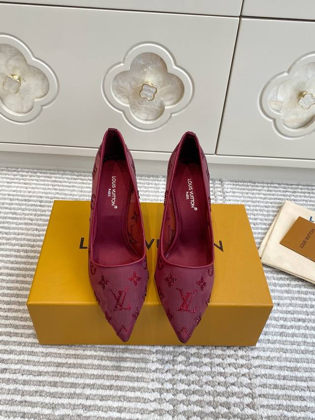 Lv驴家2025年新款 Gala网纱烫钻高跟鞋尖头单鞋 由璀璨莱茵石组成Monogram的雅致 真皮底 三个跟:平底,7.5Cm和9.5Cm 颜色:咖色.酒红.