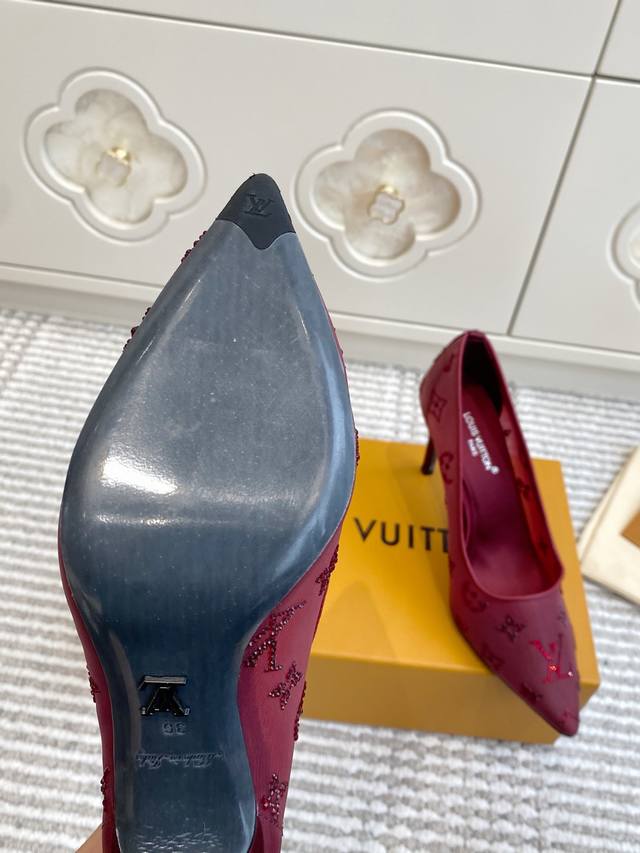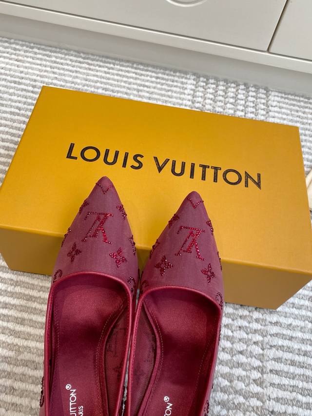 Lv驴家2025年新款 Gala网纱烫钻高跟鞋尖头单鞋 DDD 由璀璨莱茵石组成Monogram的雅致 真皮底 DDD 三个跟:平底,7.5Cm和9.5Cm DDD 颜色:咖色.酒红.杏色.黑色 DDD 正码:35-39订做34.40.41.42 DDD
