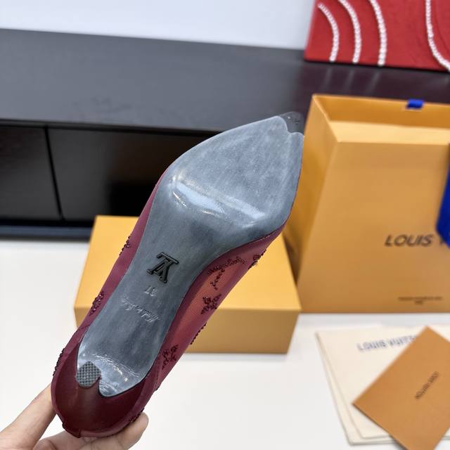 Lv驴牌2025年新款 Gala网纱烫钻高跟鞋 由璀璨莱茵石组成Monogram的雅致 真皮底 三个跟:平底,7.5Cm和9.5Cm