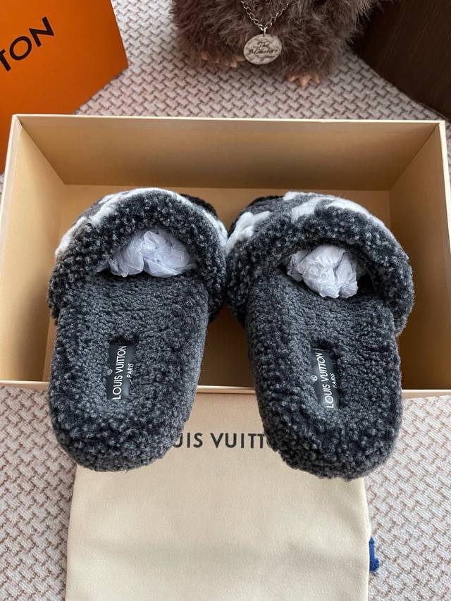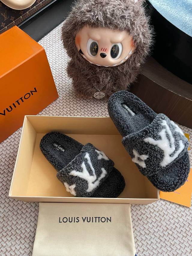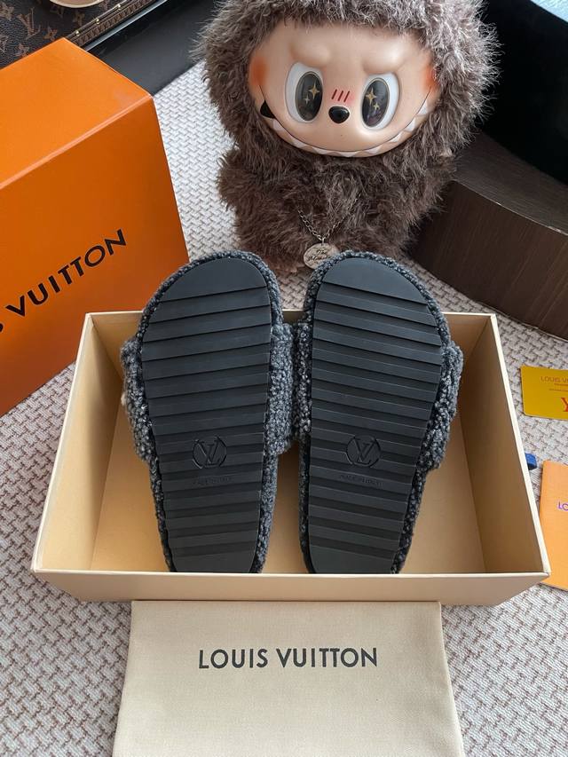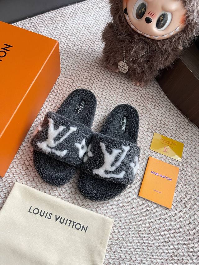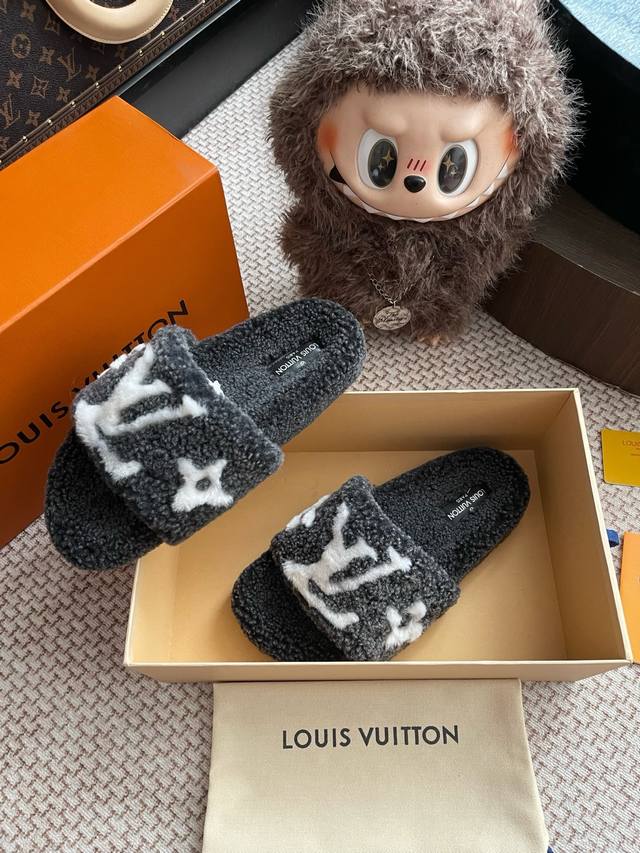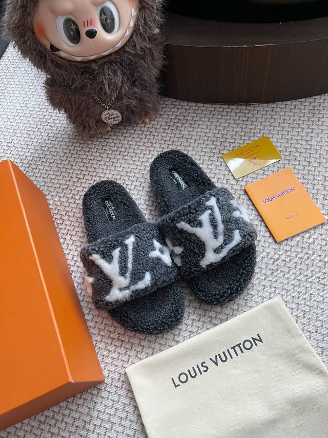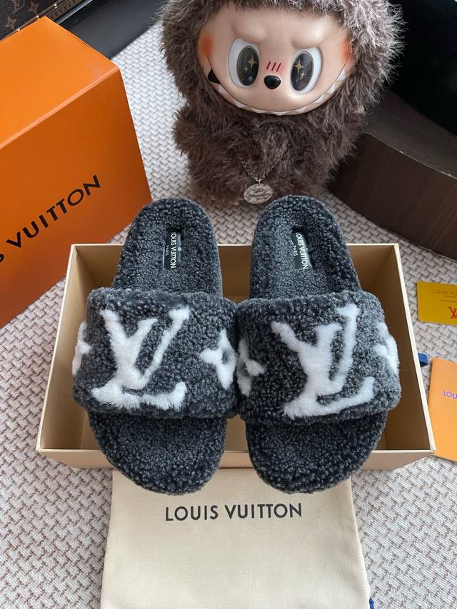 路易威登Lv秋冬最新款毛毛拖鞋~ 这双毛拖也是好好看非常高级呀 搭配秋冬的牛仔短裤 简直就是完美呀!穿上立马拥有理想的身高有没有!大爱款,有时尚元素,鞋面外表