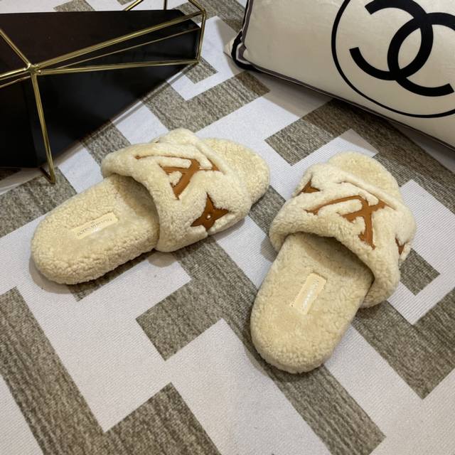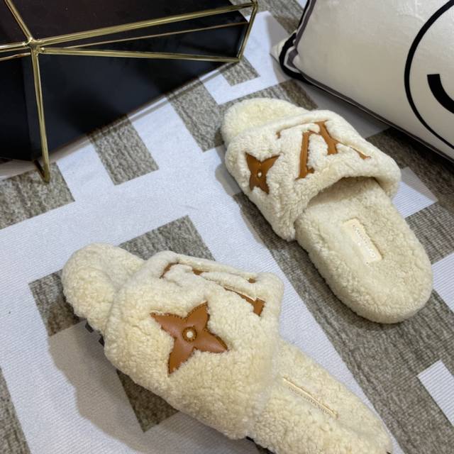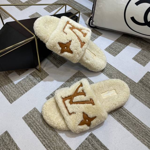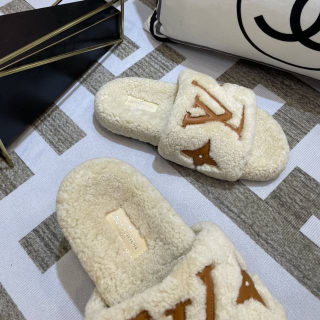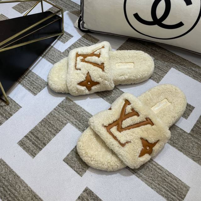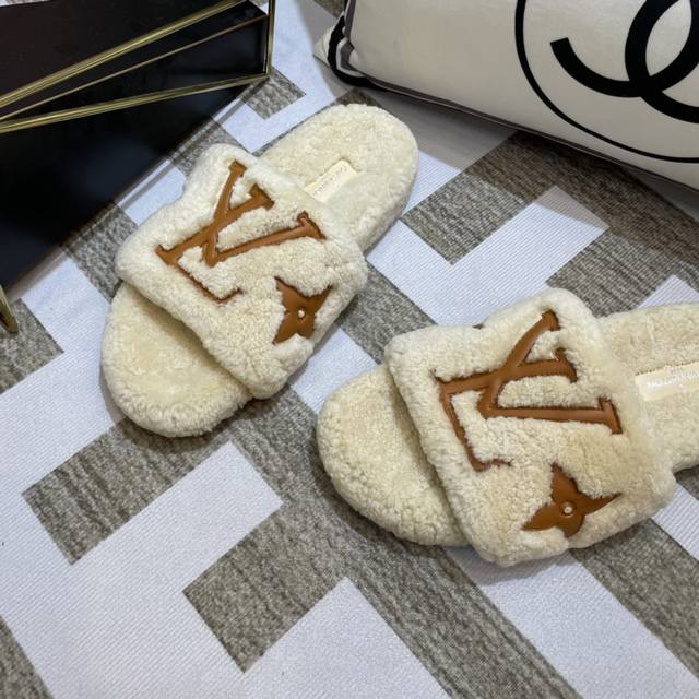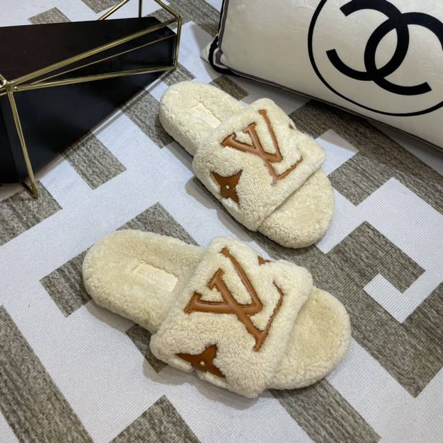 Lv 新款泰迪毛拖上新色 驴家超级爆款,羔羊毛毛拖。 今年大热的毛拖元素,各大品牌都相继出了,驴家肯定不能不入,关键是上脚太好看了,尽显大长腿,时尚百搭款毛拖蹦
