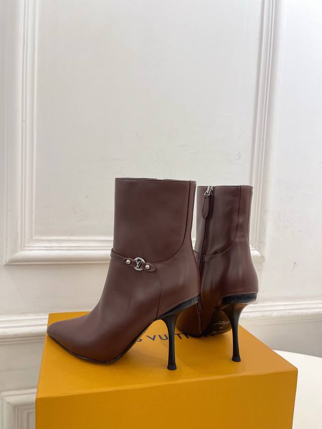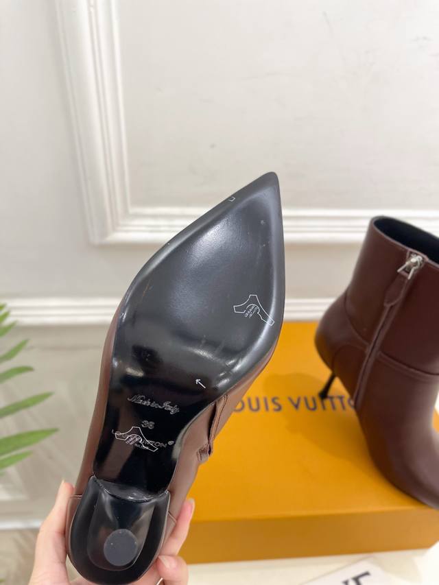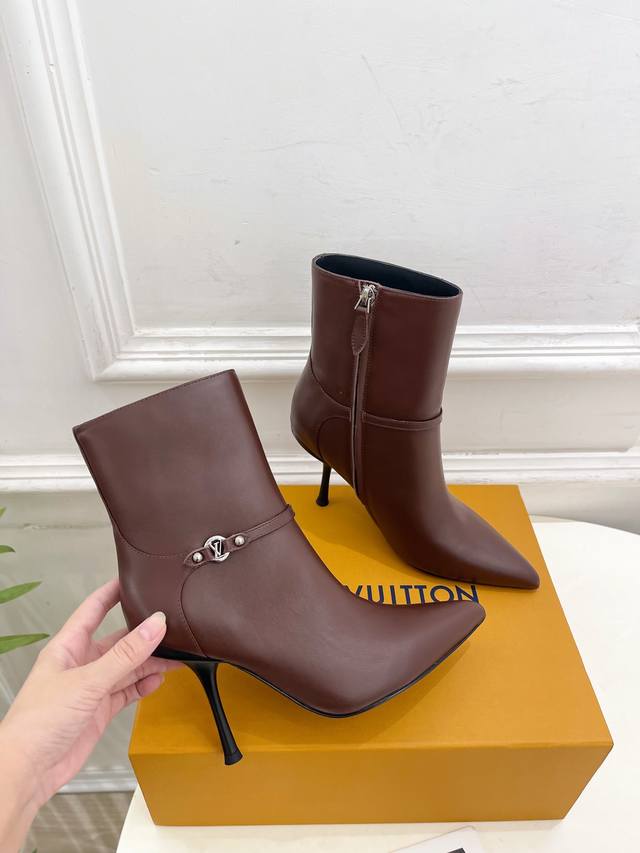 Lv 路易威登 25 2025秋冬新品 顶级版本 专柜主打最新款 老花皮带扣尖头高跟短靴 硬货上新 Bs代购级别!高级感十足!国内外博主刷爆的一款,复古又时髦 上脚美炸了!官网主推款★ T 鞋面:原版特定小牛皮 内里: 进口水染羊皮里 大底:原版意大利真皮大底 跟高:9.5Cm 鞋码: 35-39 40.41定制不退换 出厂价Pp: