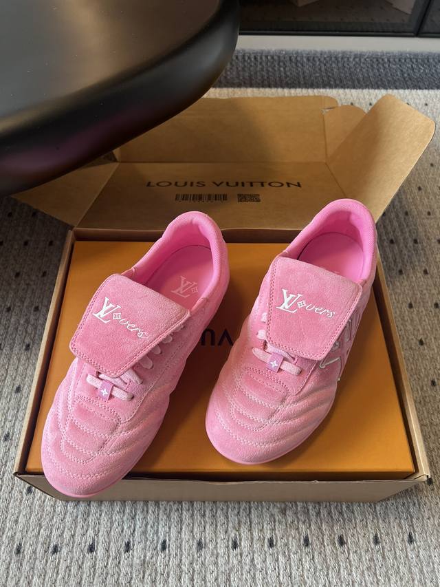 Lv Footprint Soccer 麂皮球鞋老钱风鞋款绒面牛皮鞋身,呈现微妙褪色效果,复古风格拉满,鞋舌以Lvers传递品牌标识,可拆卸,趣味性十足脚感很好穿上很舒服,鞋舌是可拆卸设计 果冻胶底整双鞋的鞋身以柔软复古的小牛皮为主鞋舌带有Lv标识构成,五趾足印橡胶鞋底是一大亮点,感觉每走一步都在大地上留下了Lv的印记走一天都不累脚,颜值直接拉满脚感绝了 软绵绵 City Walk和运动必备款鞋面:麂皮材质内里:羊皮大底:原版开模大底Size:35-45 45定制不退换