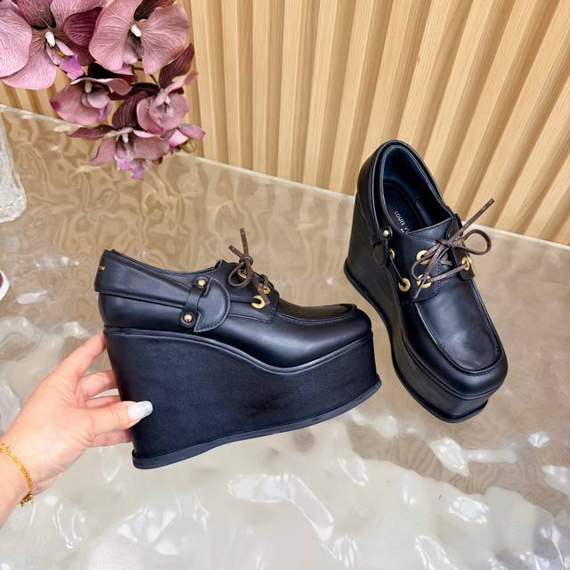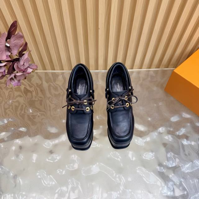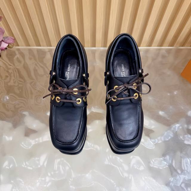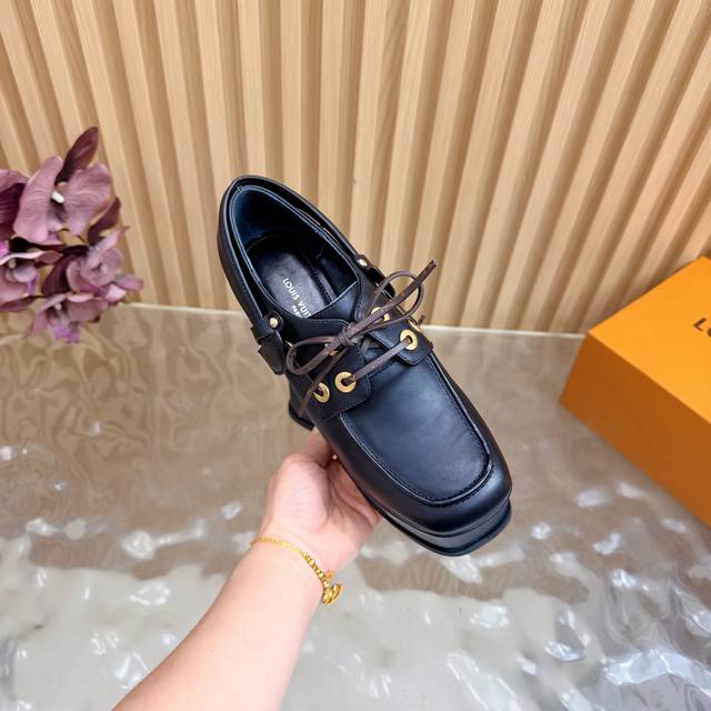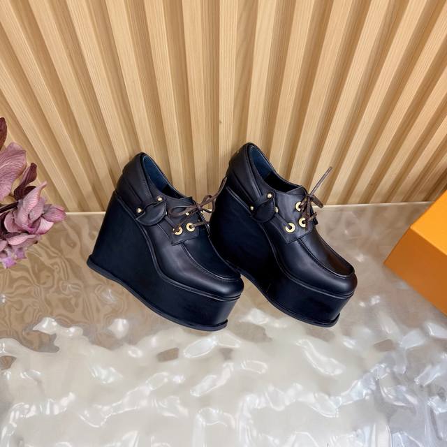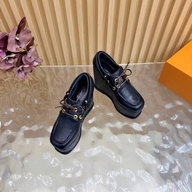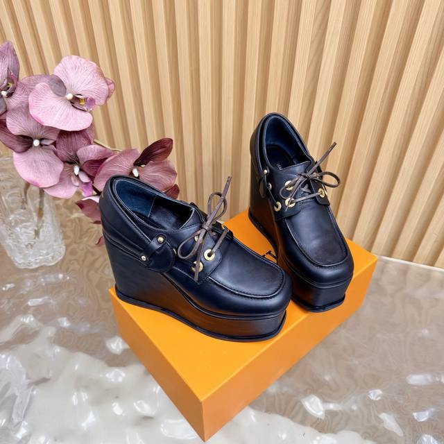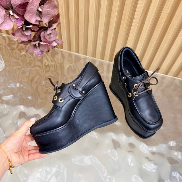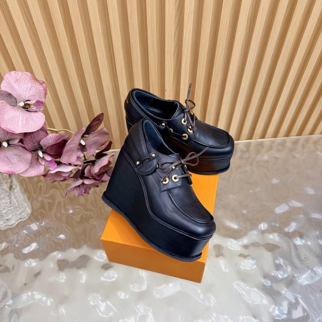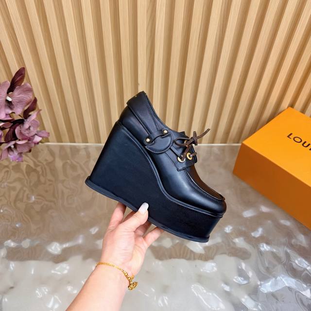 Lv Louis Vuitton.路易威登最新款坡跟防水台美鞋!这双全新厚底乐福鞋,简直是矮星人和潮流控的福音! Ddd Ddd 超A厚底设计:视觉拉长腿型,瞬间提升气场!鞋侧醒目的白色线条,勾勒出极具辨识度的轮廓,街头感十足。 Ddd 质感皮革与金属孔眼:采用品牌优质皮革打造,搭配硬朗的金属鞋带孔,完美融合了经典乐福鞋的优雅与街头机能的酷感。 DDD 面料:头层牛皮 Ddd 内里:优质羊皮 Ddd 鞋垫:优质羊皮 Ddd 鞋底:原版开模定制 Ddd 水胎高:后11.5Cm.前5Cm Ddd 包装:专柜精
