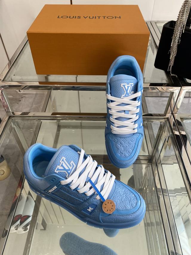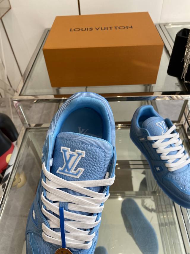 Lv Tarine路易威登L家运动鞋 滑板鞋 男款 原版购入开发 做货 本款Lv Trainer 运动鞋选用牛皮革塑造繁复鞋面,需要数小时的匠心缝制方可完成。经典构型出自 Virgil Abloh 之手,展现复古篮球鞋的灵感启发 面料: 原版定制头层牛皮 内里: 原版定制透气网里 大底: 原版开模双色Tpu组合大底 码数:39-45