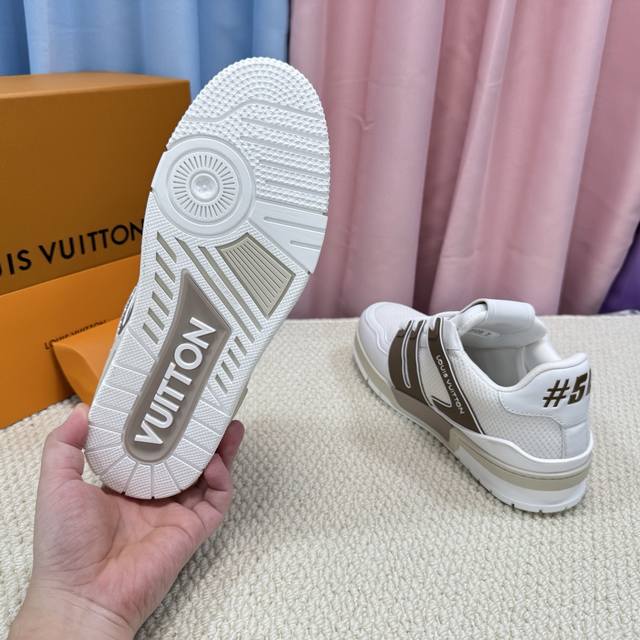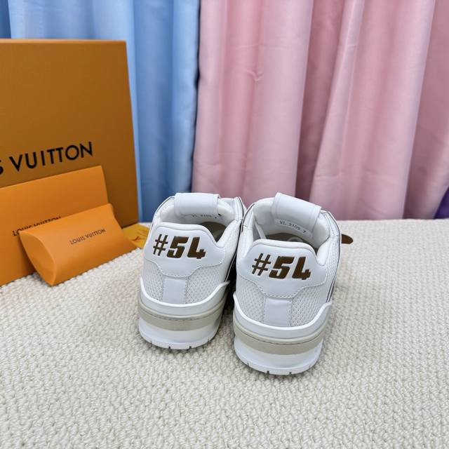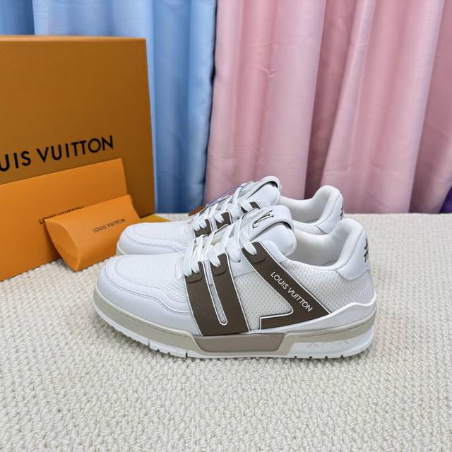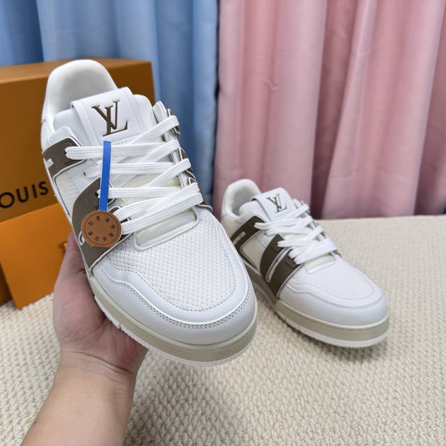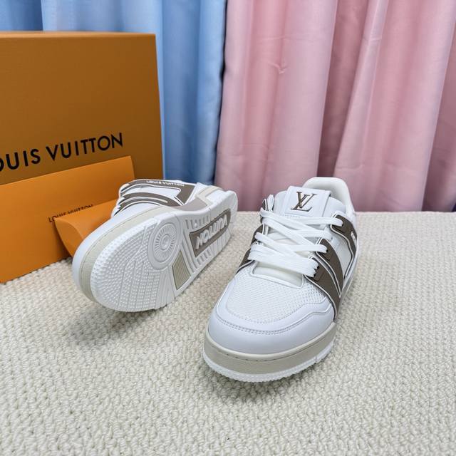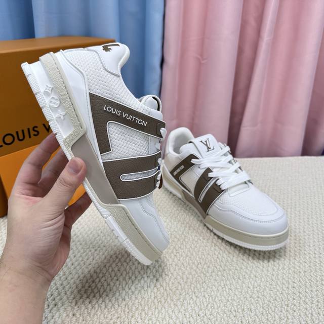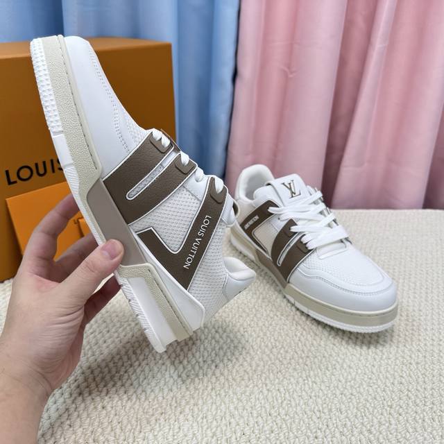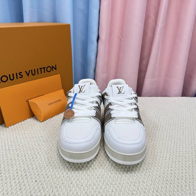 Lv-Trainer路易-威登 pk市场一切版本 情侣款 走秀新款 篮球板鞋 代购品质 原版1:1开发复刻!!上脚非常舒适 做工精细 鞋面由意大利进口小牛皮拼接,侧边饰有品牌Logo标志及签名,进口了透气网布内里,脚感超舒适。原厂特供原版双色Tpu吸模大底。套包工艺 固特异缝合锁边 DDD Size: DDD 女款35-40 DDD 男款39-45标准码 男38 46 47定做不退不换 DDD