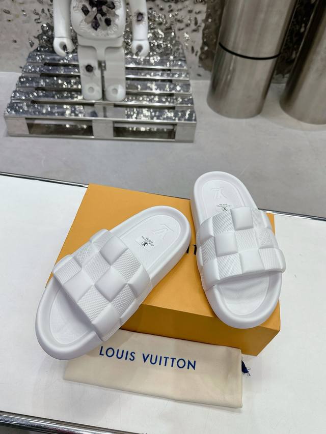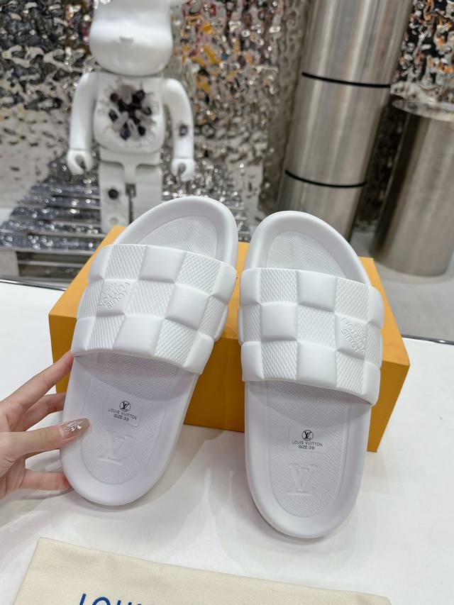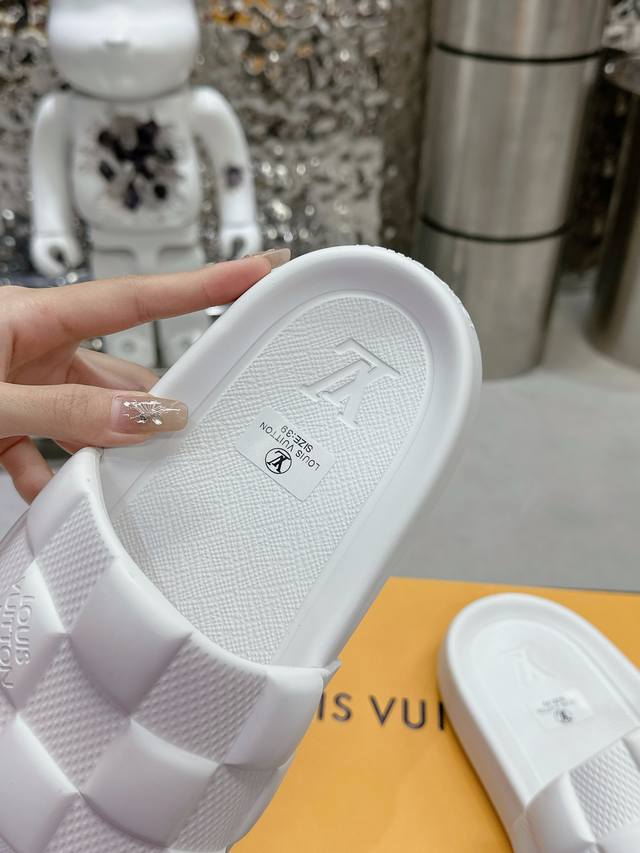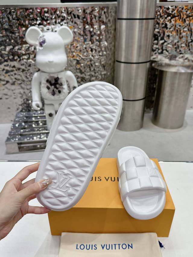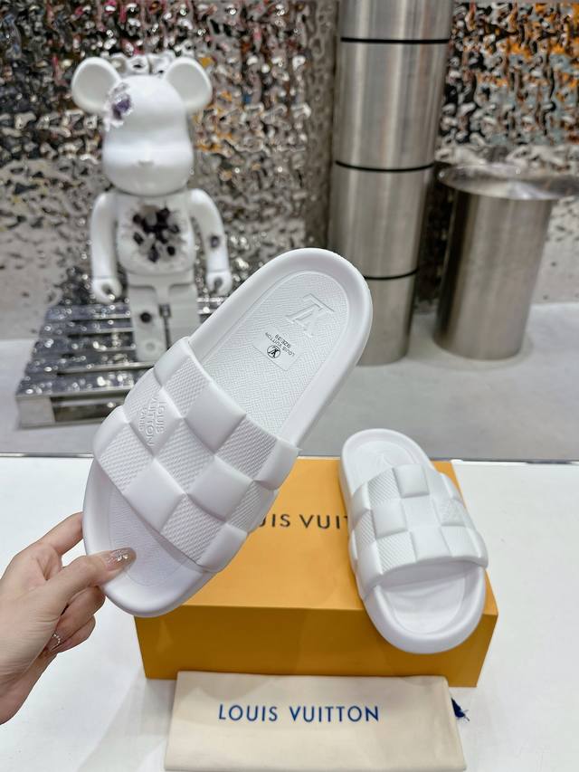 / 实价: 情侣款5路易威登专柜新款浮雕拖鞋,Lv Monogram 浮雕拖鞋,Waterfront 凉拖焕新回归,鞋面扣带压印Lv标志性的 Monogram 图案