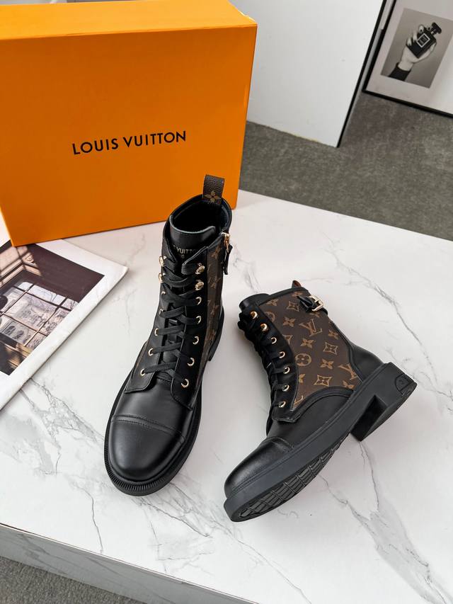 工厂P价 女装女鞋 运动原单 Louis Vuiton路易哈登2025秋冬高端定制 各大明星网红走秀款,百年经典,工艺精湛,上脚舒适 本款 Citizen 平底靴以柔滑牛皮革彰显军旅风格,令人瞩目Monogram 图案。鞋面采用压花效果,织物鞋带和 Monogram 帆布后袢带完善细节。侧拉链设计方便穿脱。 面料:全粒面牛皮 内里 :牛皮 饰扣:原版开模 大底:原版开模 颜色:黑色 咖色 码数36一40 41 42可以定做 不退换
