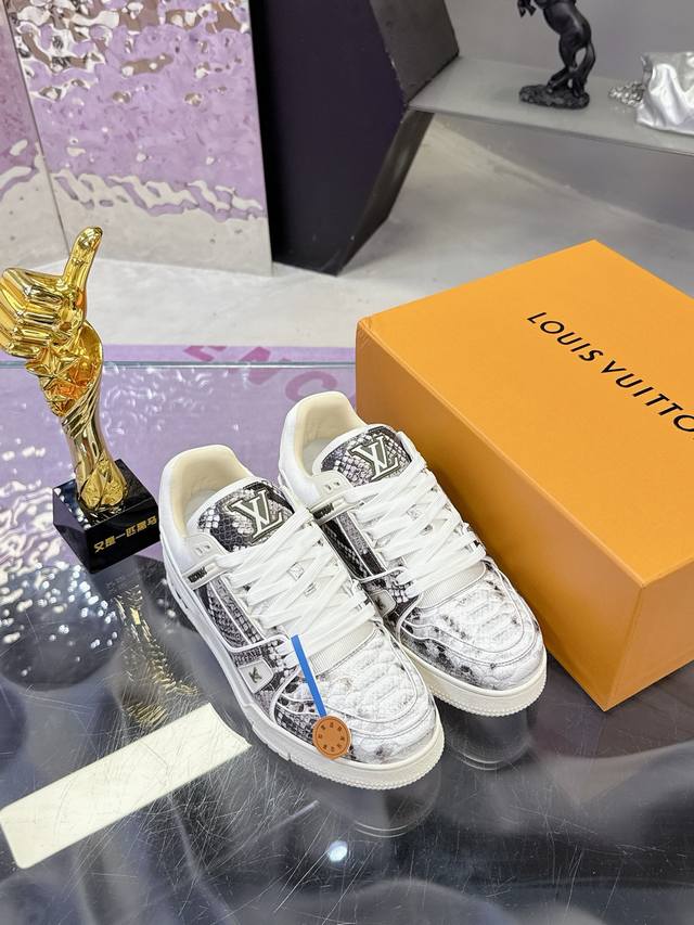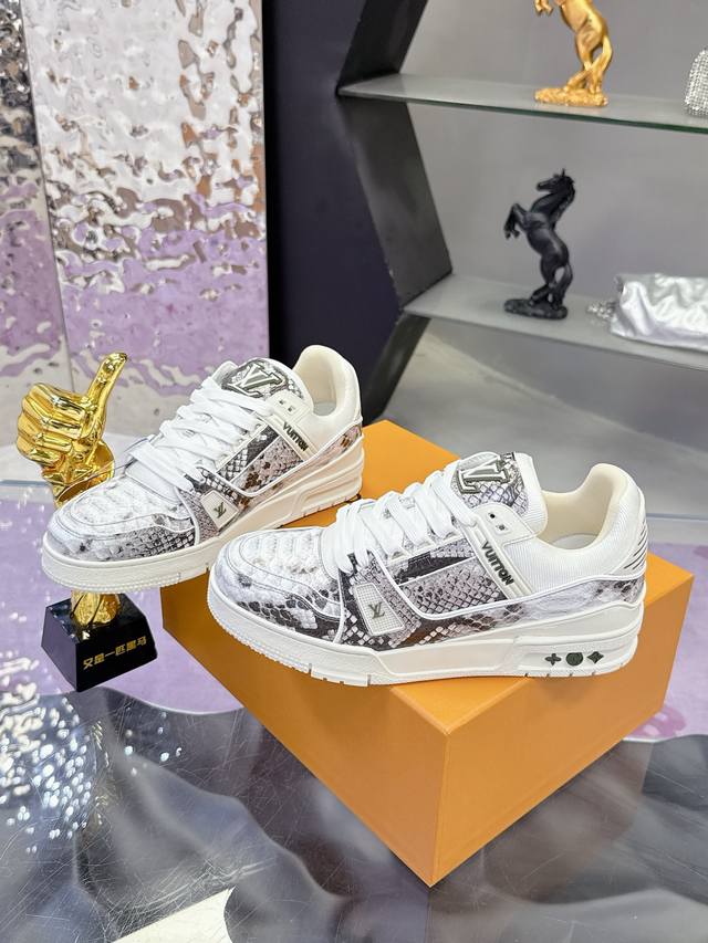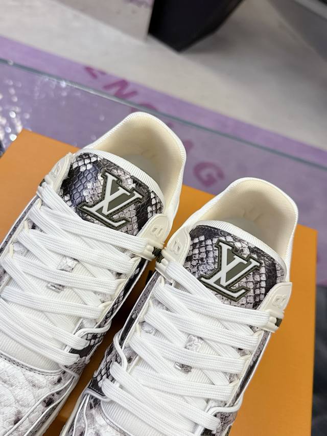 工厂p价p: DDD 头层牛皮 蟒蛇纹系列 DDD 原版开发 品质出货 欢迎对比 Lv板鞋系列 DDD Lv Trainer Maxi运动鞋将成衣系列的宽松廓形引入Virgilabloh笔下的Lvtrainer运动鞋设计,在 春夏男装秀场瞩目亮相。牛皮革鞋面结合粗犷织物鞋带,以缤纷串珠点明品牌经典元素。Lv字母标注鞋舌,Monogram花卉栖身外底。 DDD 混合材质 DDD 采用头层牛皮制成,进口定制专用印花牛仔布包裹,粗鞋带系带设计,侧面带 Monogram 大印花, 鞋舌及后跟”Lv 54“徽章点缀