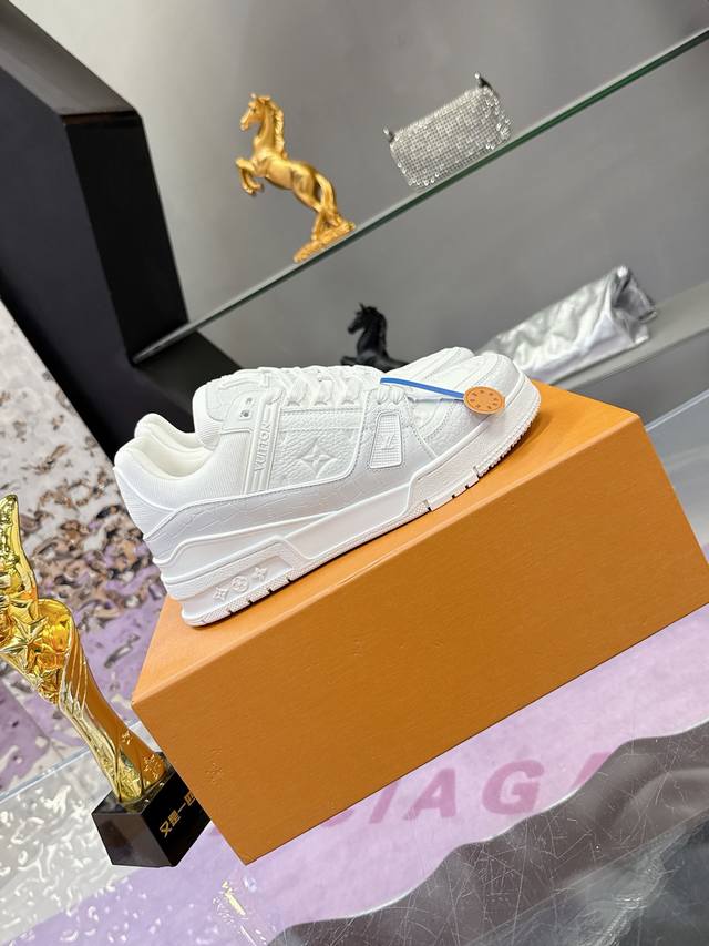 工厂p价p: DDD 2025最新颜色 出货 DDD Lv 路易威登L家 驴牌 Trainer系列 情侣款 休闲 运动鞋 滑板鞋 DDD 原版购入开发 做货 本款Lv Trainer 运动鞋为正绒面牛皮革鞋身压印Damier图案,演绎复古篮球鞋的灵感启发。多重标识彰显品牌格调。可拆卸Monogram花卉标签与#54标识分饰鞋带与后部 DDD 配送专柜精美包装 DDD 面料: 原版定制进口材料 DDD 内里: 原版定制透气网里 DDD 大底: 原版开模防滑Tpu组合大底 DDD 底厚: 3Cm DDD Si