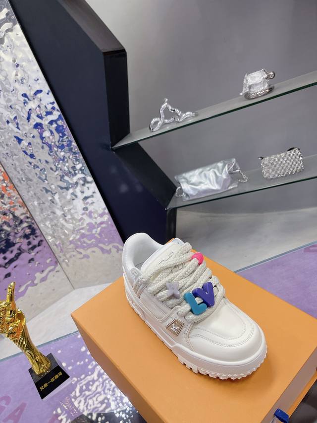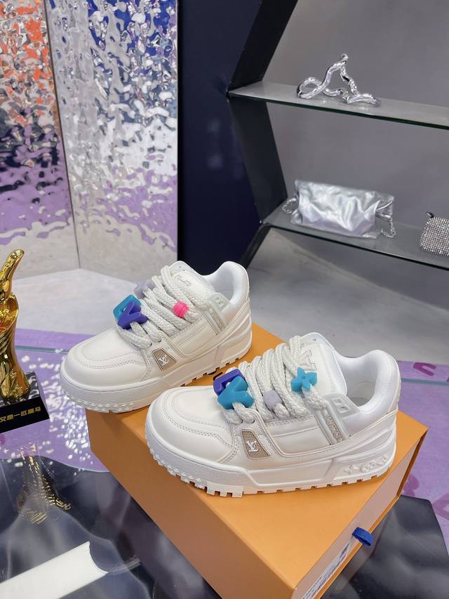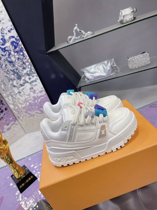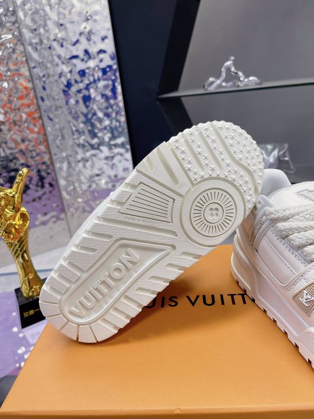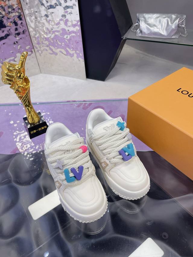 工厂P价P: Lv胖丁 情侣款 高版本货比三家 目前此版本只做Zp上市的 最高还原所有细节 、包装 Lvtrainer小胖丁 最新升级版本 原版一致 独家开模 市场天花板级 欢迎对比 对版私模大底 大星星颗粒 区别市场单薄的小星星对版饰品级扣子 扣子开模了一个月才定版! 每一个扣子都光滑不粗糙,晶莹剔透的质感!鞋腰对版做了松紧带 更能护好脚踝 提高舒适度,区别于市场货。中底布 是虚实相间的 独家打印效果 避免一眼假! 码数:女35-40 男39-45
