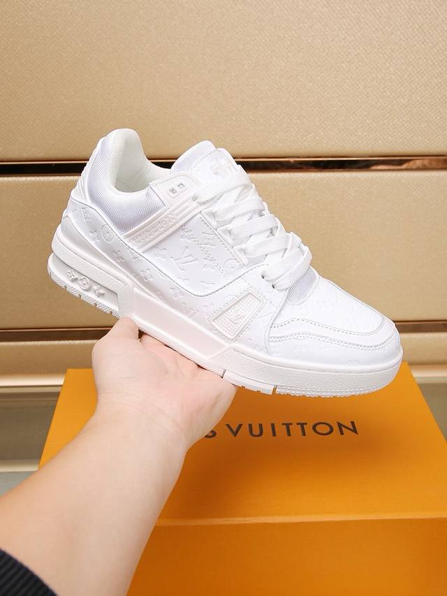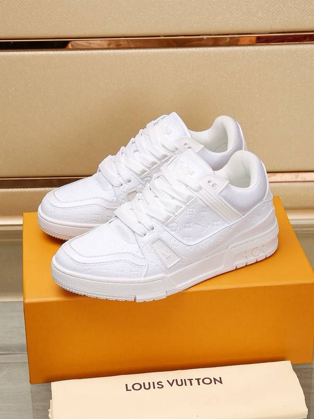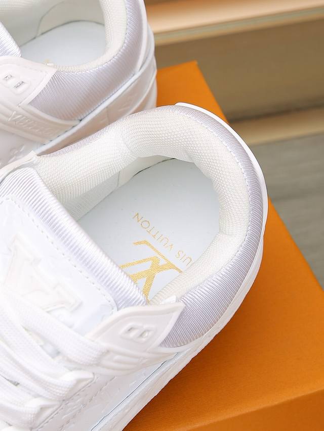 路易 L家驴牌 厚底 休闲 运动鞋 以光滑牛皮革塑造考究设计 可轻松融入各式造型 瞩目 Lv 字母标注鞋侧 轻盈橡胶外底点缀 Vuitton...
