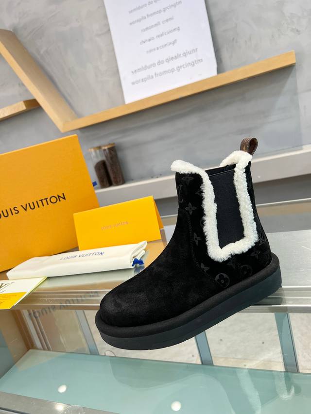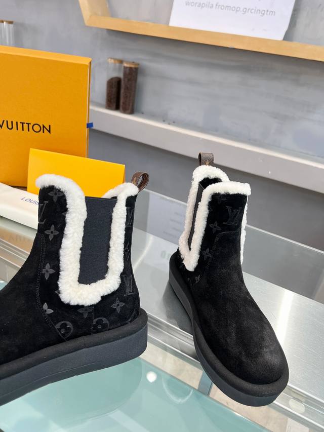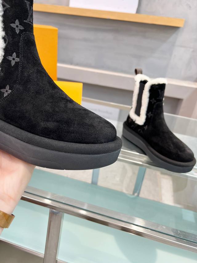 / 短靴 面料:采用进口高丝光牛猄皮面压花Lv 字母和Monogram 花卉点缀,搭配皮毛一体毛条装饰松紧带,更显时尚,羊皮内里,进口高密度橡胶美耐底 高密度发泡材