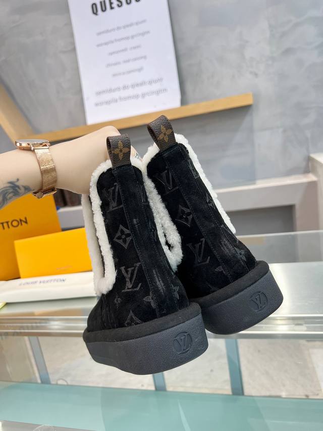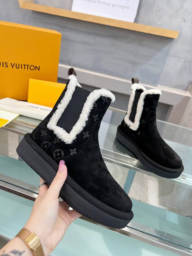 短靴 Ddd 面料:采用进口高丝光牛猄皮面压花Lv 字母和Monogram 花卉点缀,搭配皮毛一体毛条装饰松紧带,更显时尚,羊皮内里,进口高密度橡胶美耐底 高密度发泡材质填充 ,轻盈舒适,鞋底有一定厚度,增高效果也不错!精品 Ddd 码数:35-41 DDD