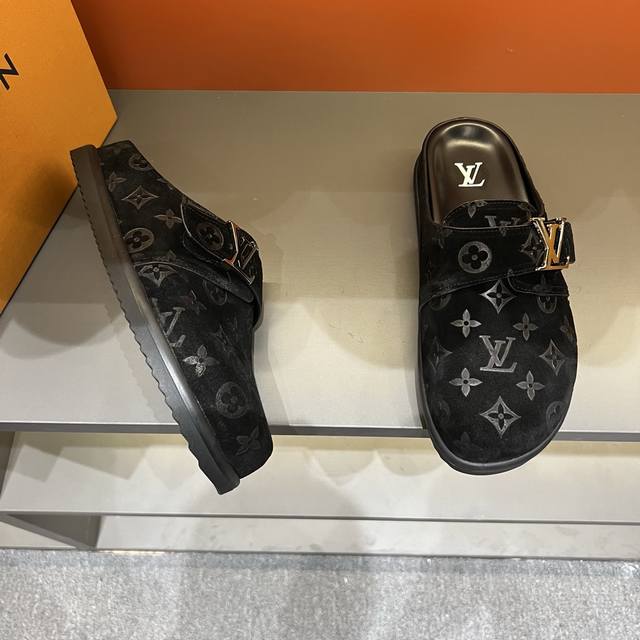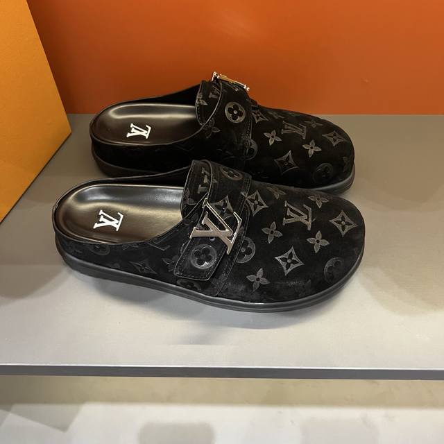 / 调工厂p价 男装男鞋 运动原单,38-45 Lv Easy 2025新款男士休闲凉拖拖鞋,取材绒面牛皮革,以Monogram 图案彰显潮流风范。Lv 字母点亮可