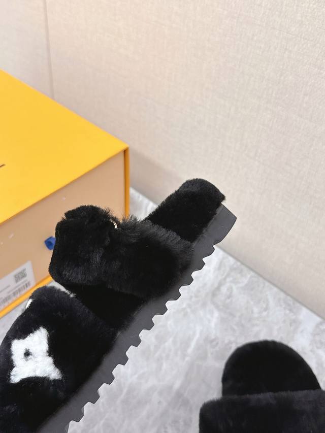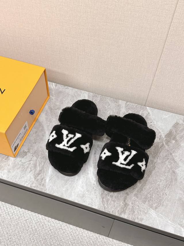 路易威登Lv秋冬最新款毛毛拖鞋~ 这双毛拖也是好好看非常高级呀 搭配秋冬的牛仔短裤 简直就是完美呀!穿上立马拥有理想的身高有没有!大爱款,有时尚元素,鞋面外表